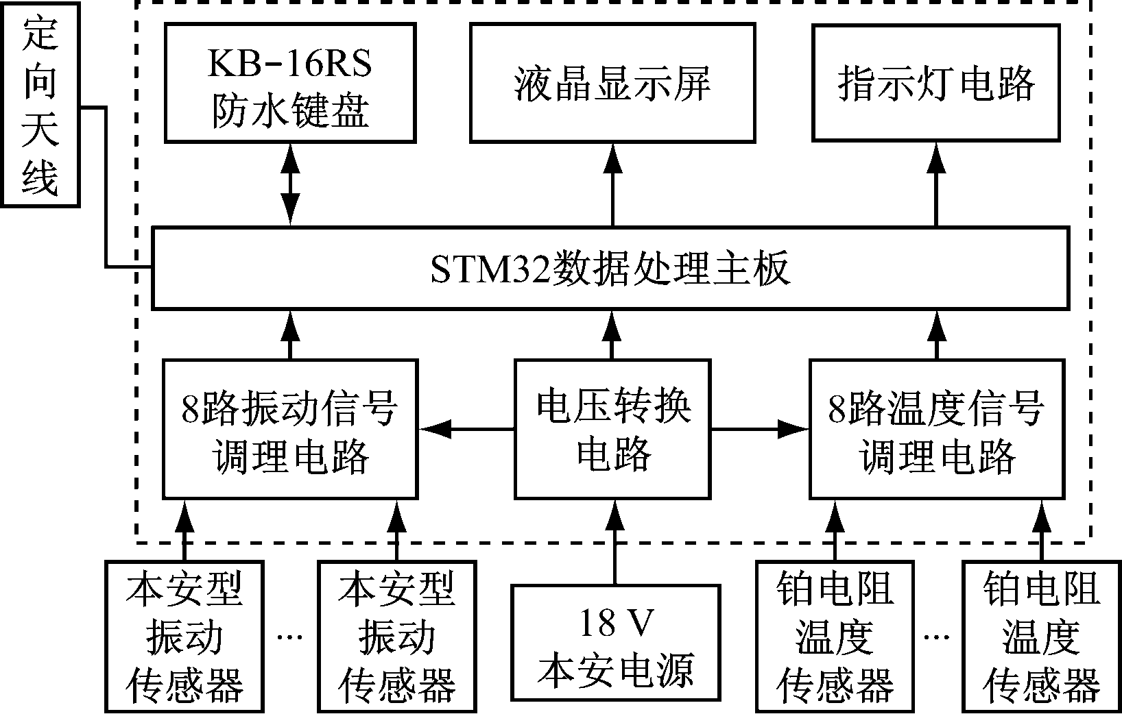 目前对煤矿机电设备进行监测时常用状态信息主要有振动和温度,能很好地反映设备运行状况,因此,针对设备振动和温度信号的采集设计监测子站,其总体结构如图1所示。
