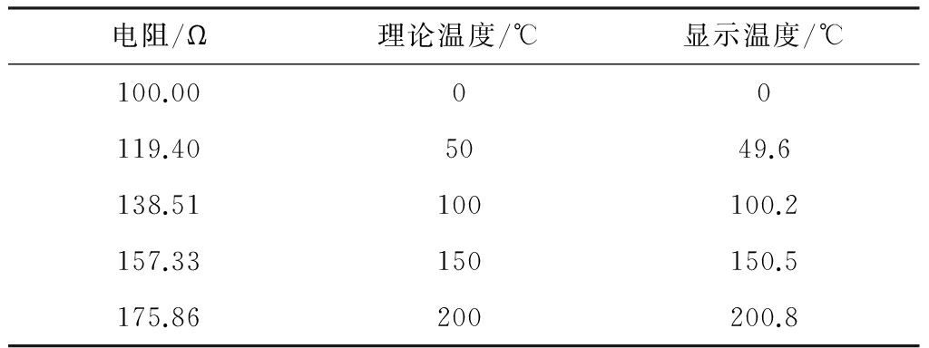 温度测试时采用电阻箱代替铂电阻温度传感器,并按PT100铂热电阻的分度表来设置不同温度对应的阻值,读取并记录液晶屏显示的温度信息,结果见表1。可看出温度测量误差不超过±1 ℃,满足设计要求。