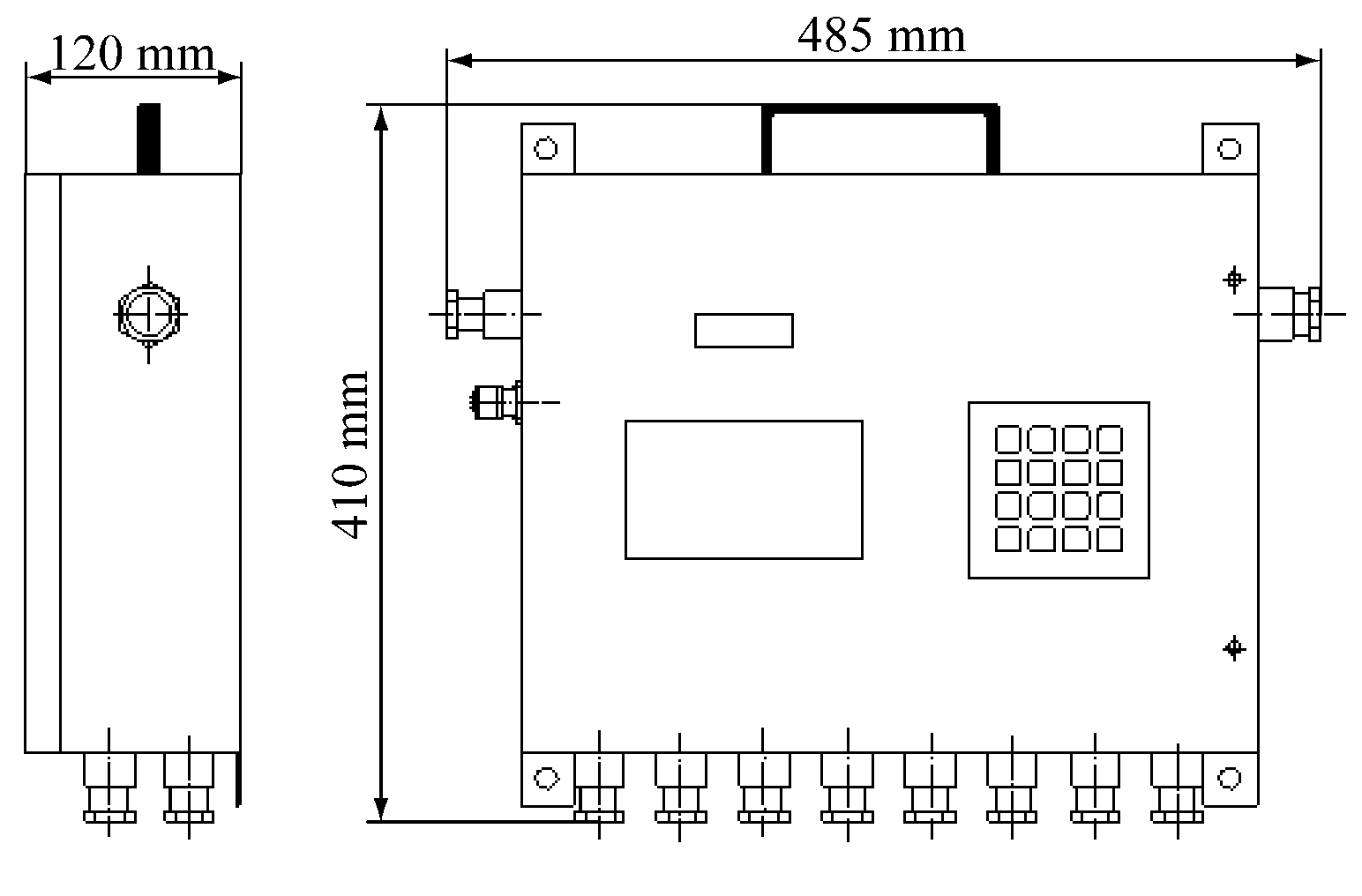 根据本安设计要求,监测子站外壳应结实可靠,具有防尘、防水、防爆、防腐蚀性能[9],达到IP54防护等级,同时所有输入输出接口必须防水且不暴露在煤矿井下环境中。因此,采用304不锈钢设计防护外壳,其外形结构如图6所示。外壳壳体上共设计有18个输入输出接口,除1个采用防水射频连接器外,其余均采用与壳体焊接成一体的防爆电气设备电缆引入装置。液晶屏和指示灯视窗均采用有机玻璃和橡胶垫压紧密封,防水键盘安装在外壳上盖。