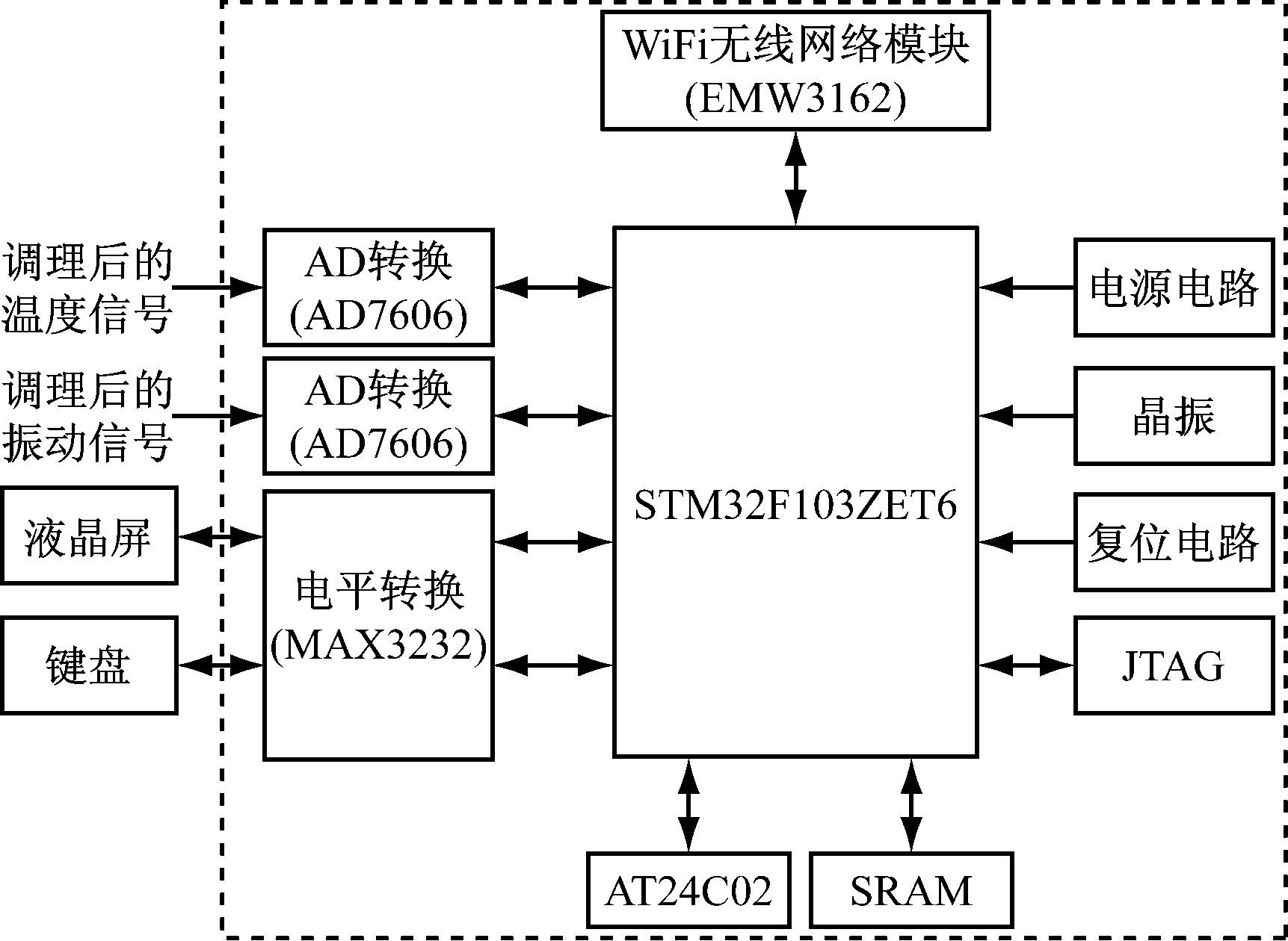 STM32数据处理主板对调理后的温度、振动信号进行模数转换处理,并通过WiFi实现数据无线传输,其硬件结构如图4所示。采用具有8输入通道的AD7606进行模数转换。核心处理器STM32F103ZET6采用FSMC接口与AD7606连接,实现多通道数据采集[7]。选用低功耗、高速率串口/WiFi无线网络模块EMW3162实现WiFi无线通信功能,该模块集成了TCP/IP协议栈和WiFi驱动,通过UART接口与STM32F103ZET6交互数据。
