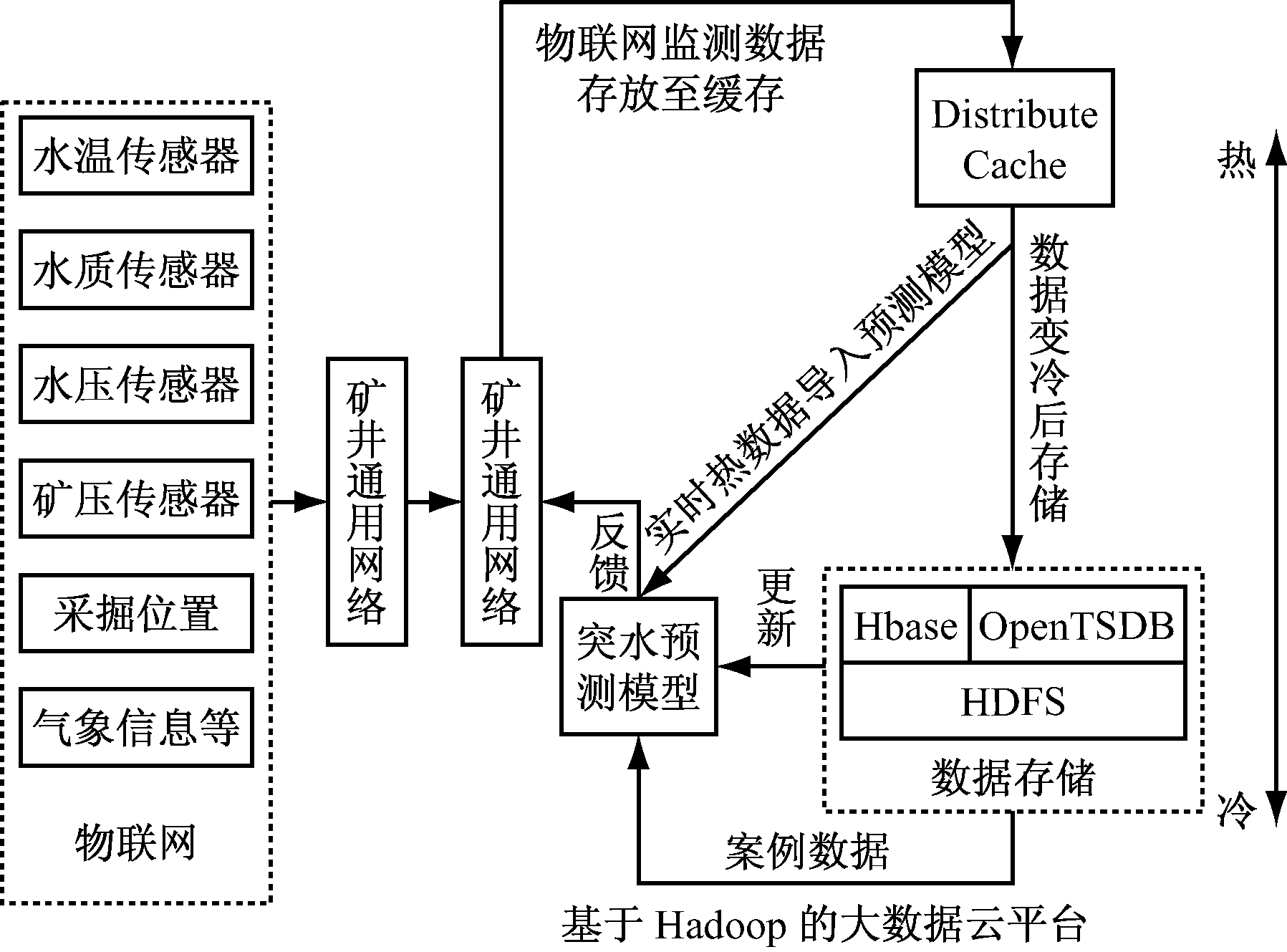 在煤矿行业中,为安全管理积累了大量的表征矿井突水过程(致灾环境、致灾因子、造成的灾害损失及人类对灾害的响应等)的事故案例数据(文字、图形、视频等)。在矿井水害防治过程中,大量的水文监测传感器、矿压及应变传感器、采掘定位设备、采动岩体破坏监测设备产生了大量数据[16-18]。数据体量巨大、种类繁多、价值密度低、增长速度快,符合大数据的“4V”特征[19-20]。下文将以矿井水害实时预测为例说明物联网、大数据和云计算在矿井水害案例库建设中如何有机结合(图3)。将物联网实时监测数据通过矿井通用网络经调度指挥中心上传至大数据云平台,并通过DistributeCache以缓存的形式进行暂存;将实时监测热数据推送到以矿井水害案例数据为基础建立的突水预测模型,进行矿井突水危险性评价;并将结果实时反馈给调度指挥中心,随着时间的推移,数据变冷,最终将数据从DistributeCache转存到HDFS文件中;定期对矿井水害预测模型进行训练和更新,进而形成一个完整、闭合、不断完善的系统。
