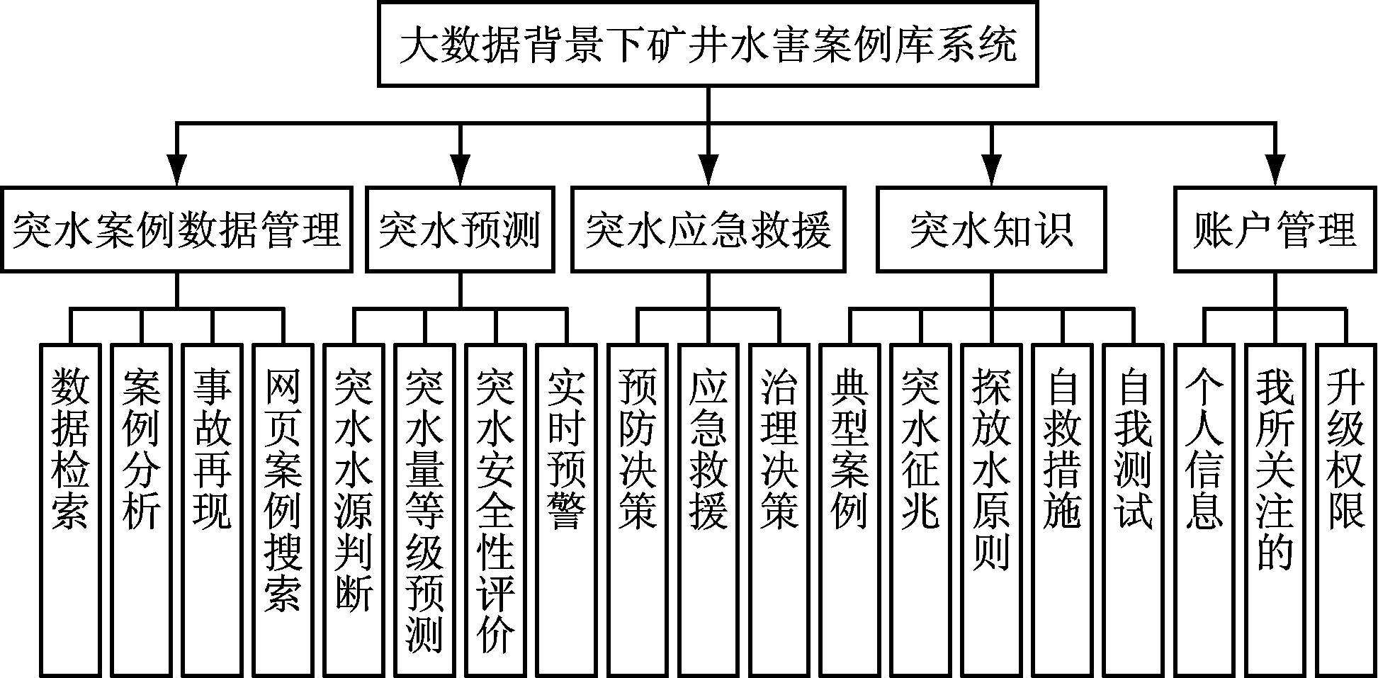 大数据背景下矿井水害案例库系统主要包括突水案例数据管理、突水预测、突水应急救援、突水知识、账户管理等功能模块,如图2所示。