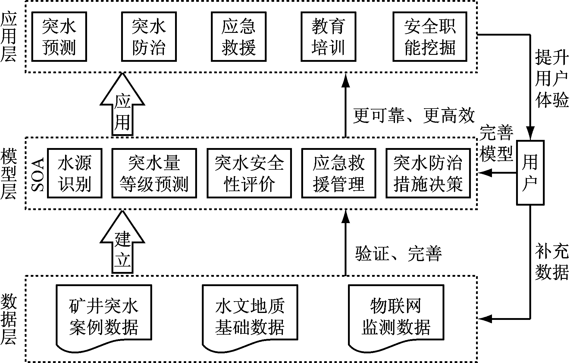 采用面向服务的体系架构(SOA),针对不同层次的用户设计了可扩展、智能的矿井水害案例库系统(图1)。该系统以矿井水害案例数据为基础建立水源识别、突水量等级预测、突水性安全评价、突水防治措施决策、应急救援等模型;用户利用上述模型将水文地质基础数据和物联网实时监测数据用于水害预警。系统以更好的用户体验为驱动,技术人员根据用户意见修改完善模型,以提供更可靠、更高效的服务,提升用户体验,随着用户规模的扩大和数据量的激增,将更有助于模型的验证和完善,进而形成一个循环、良性的大数据矿井水害案例库系统。