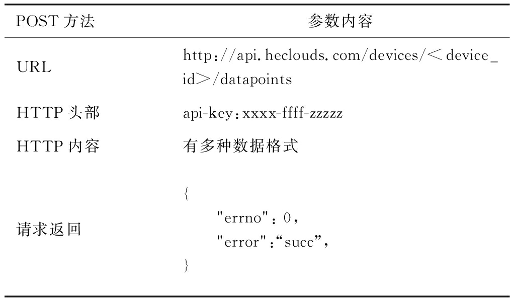表1给出了常用的HTTP方法及其作用,表2给出了使用POST方法上传数据的参数内容。在OneNET平台完成注册并建立设备后,即可获得相应的api-key与<device_id>,作为传输数据至OneNET平台的用户权限验证。
