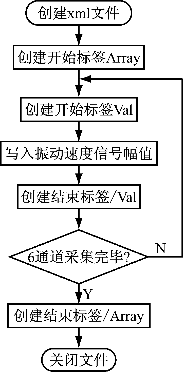 XML即可扩展标记语言,具有简单、友好的特性,被广泛应用于数据交换和数据存储。Qt提供了QtXml模块,帮助用户实现xml文件的读写操作。通风机振动信号的存储使用Qt提供的QXmlStreamWriter写入xml文件,如使用QXmlStreanWrite::StartElement创建开始标签,QXmlStreanWrite::EndElement创建结束标签,QXmlStreanWrite::setAutoFormatting开启自动缩进,QXmlStreanWrite::writeAttribute设置标签属性,QXmlStreanWrite::writeText Element写入包含文本内容的标签[9]。数据存储程序流程如图4所示。