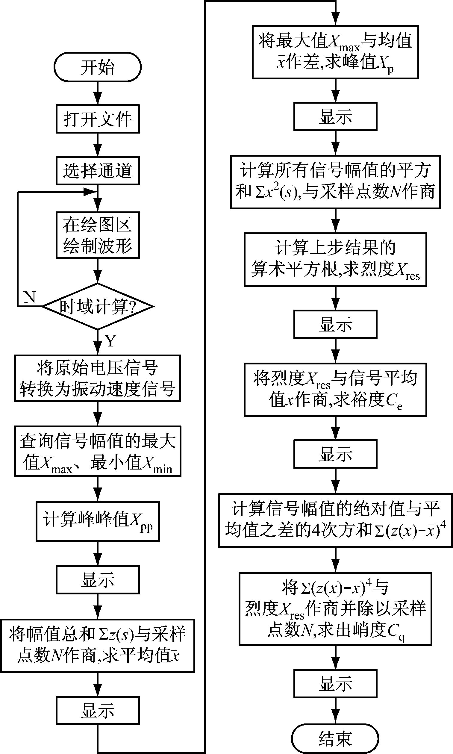 在嵌入式应用中,首先读取xml文件中的振动信号,然后将振动信号单位转换为振动速度单位,根据各指标计算公式,计算各时域指标并显示。时域指标分析程序流程如图5所示。