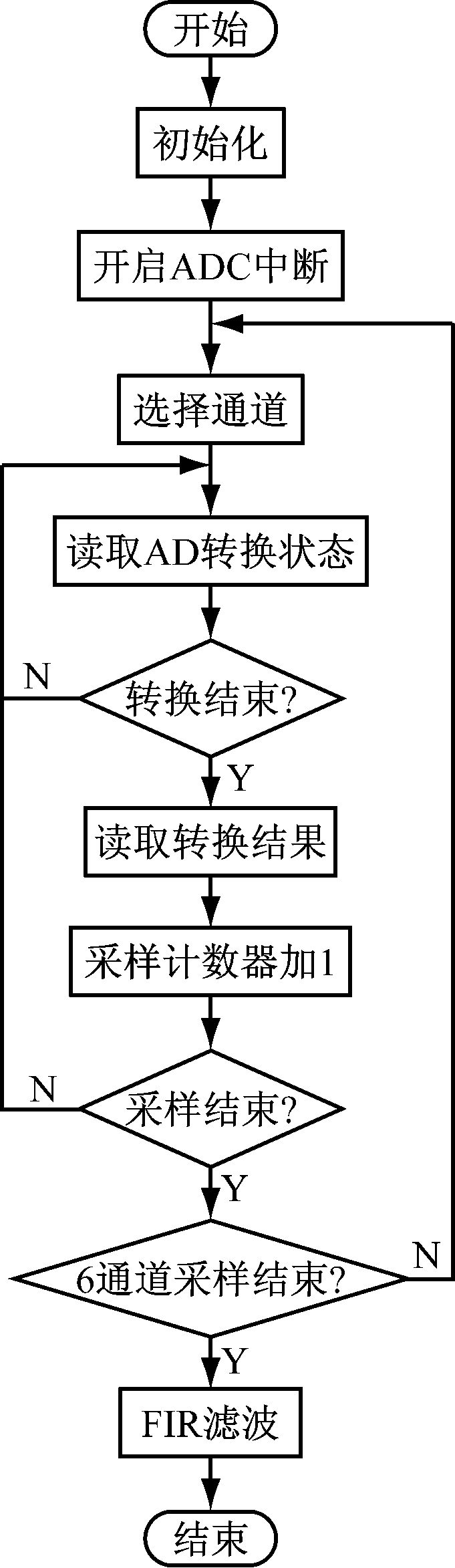 为保证故障诊断结果的准确性,应对采集信号进行低通滤波处理,去掉频率过高的噪声信号。在完成一次完整的采集后对采集到的信号进行低通滤波处理,设计FIR低通滤波器滤除高频噪声,设置低通滤波器的截止频率为167 Hz,具体数据采集程序流程如图3所示。