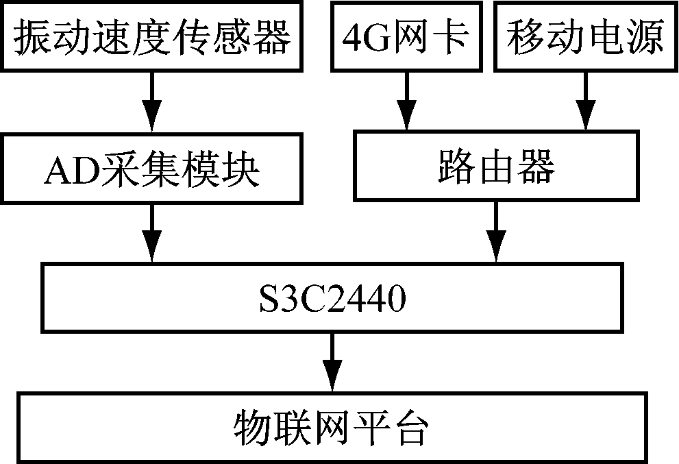 基于物联网的矿井通风机远程监测系统由4G网络、振动速度传感器、嵌入式系统及物联网平台组成,系统结构如图1所示。