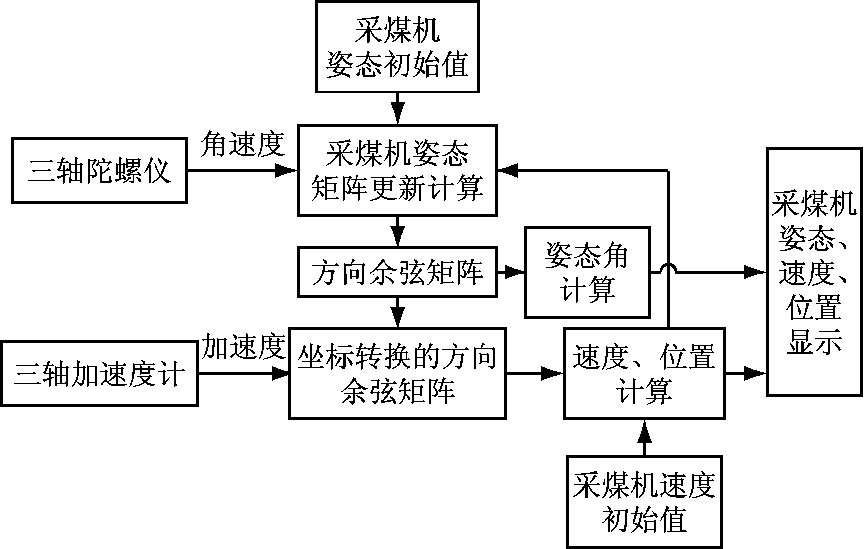 捷联惯导系统(Strapdown Inertial Navigation System,SINS)[8]是一种不依赖任何外部信息的自主式导航系统。它将三轴陀螺仪和三轴加速度计等惯性敏感器件直接固定在运动载体上,利用陀螺仪和加速度计实时测量运动载体的三轴角速度和三轴加速度,并结合运动载体初始惯性信息,通过高速积分获得运动载体的姿态、速度及位置等信息[9]。基于捷联惯导的采煤机定位原理如图1所示。SINS具有安装简便、可靠,能够利用载体自身惯性信息进行定位,不向外辐射能量等特点,因此,许多学者对SINS用于采煤机定位的可行性进行了深入研究。