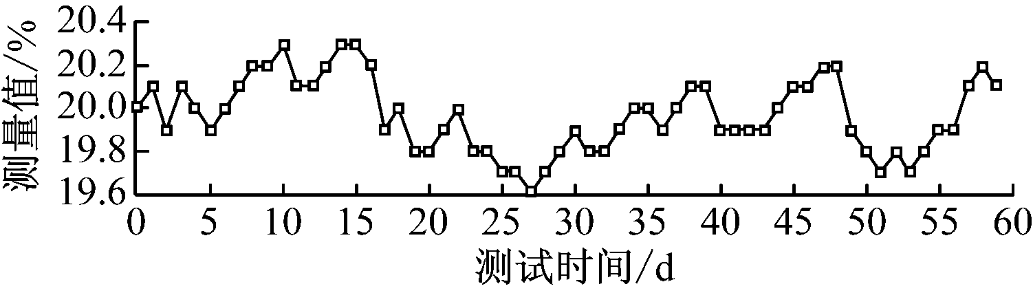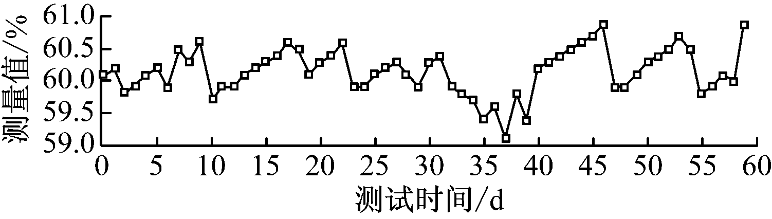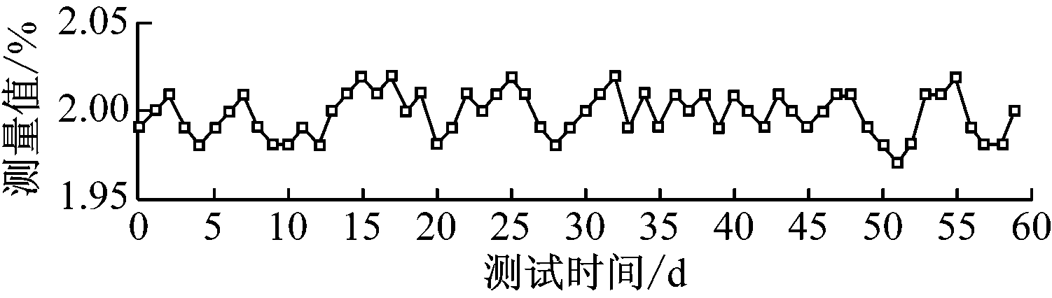 为测试系统在长时间工作条件下的性能,每天分别通入2.00%,20.0%,60.0%的标准甲烷进行为期60 d的稳定性测试,其中1号支路的测试结果如图4所示。可看出测量值波动范围较小,测量误差均小于2%。