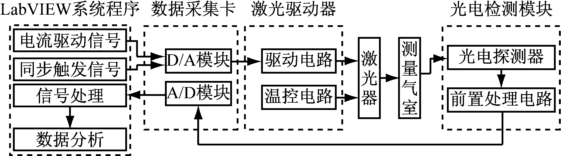 被气体吸收后的光波通过光电探测器转换为电信号,利用谐波检测法得到二次谐波和一次谐波信号幅值比,可反演得到光路中待测气体浓度[10],从而有效消除光源功率波动、固有噪声等共模噪声引起的系统误差[11]。
