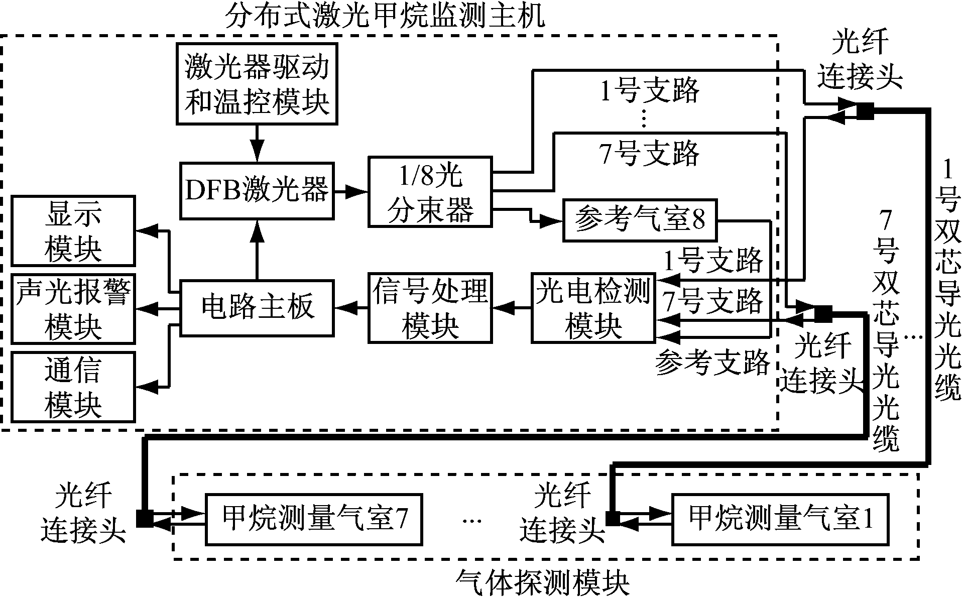 分布式多点激光甲烷检测系统主要由分布式激光甲烷监测主机、双芯导光光缆和气体探测模块组成,如图2所示。该系统采用DFB(Distributed Feedback,分布式反馈)半导体激光器,根据Hitran光谱数据库,设定激光器中心波长为1 653.7 nm,甲烷对该波长的光波吸收率较强,可避免水气和其他烷烃气体的干扰。激光器在驱动和温控模块控制下,出射特定光谱的激光光波。光波经1分8光分束器后,转换成8路光波,再经过导光光缆传输至甲烷测量气室(待测点)。光波被甲烷按比例吸收后,携带信息的光波由测量气室中的光纤准直器耦合进导光光缆,并由光电检测模块中的InGaAs光电探测器将光信号转换成电信号,再经过信号处理模块进行放大、滤波、锁相、互相关等处理,得到待测信号的一次谐波和二次谐波波形,再经数值分析反演得到待测甲烷浓度。为提高系统稳定性,系统内置甲烷浓度恒定的参考气室作为参考光路,用于自动锁定激光器出射光波的中心波长,并根据解算的参考气室内甲烷浓度对系统检测值进行实时修正[15],从而实现系统免标校功能。