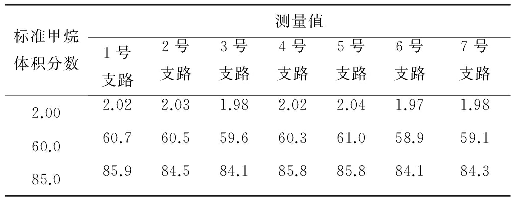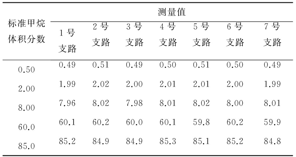 系统各支路相对独立,由于气室长度、光电探测器等存在差异,测试前需对各支路测量气室通入氮气和20.0%标准甲烷进行线性标定。对系统各支路测量气室分别通入0.50%,2.00%,8.00%,60.0%,85.0%标准甲烷,测试数据见表1,可看出系统最大误差小于1%。