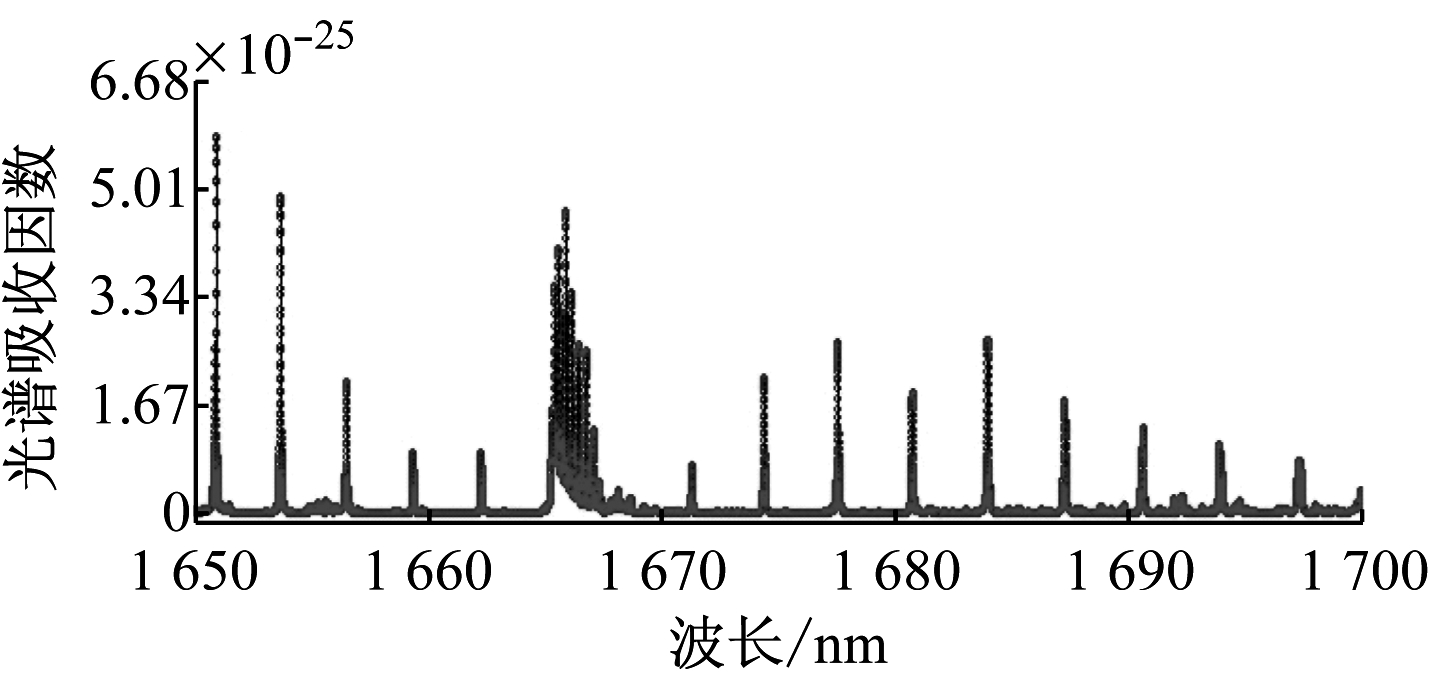 气体分子的吸收光谱由电子光谱、转动光谱和振动光谱3部分组成,与分子的跃迁能级结构相联系[7]。甲烷分子有4个固有振动频率[7],每个固有振动频率对应1个光谱吸收区域,甲烷分子在近红外区同时有许多泛频带和联合带[8-9]。根据美国高分辨率大气光谱数据库Hitran,在1个标准大气压、温度为27 ℃时,甲烷在近红外区的吸收光谱如图1所示。