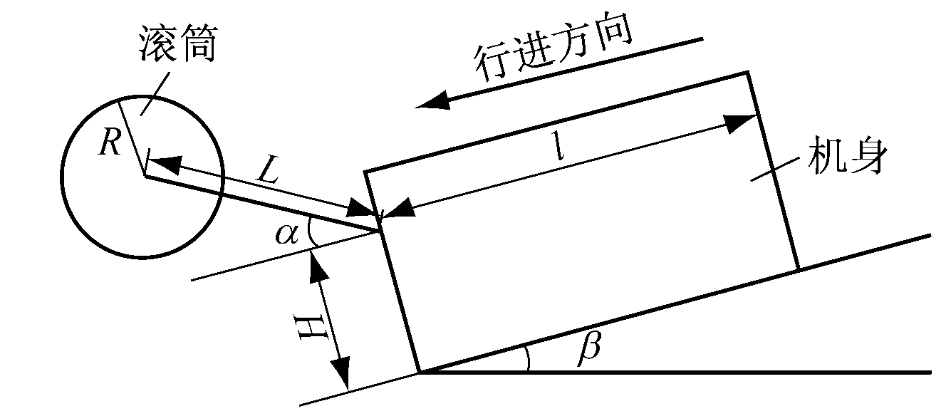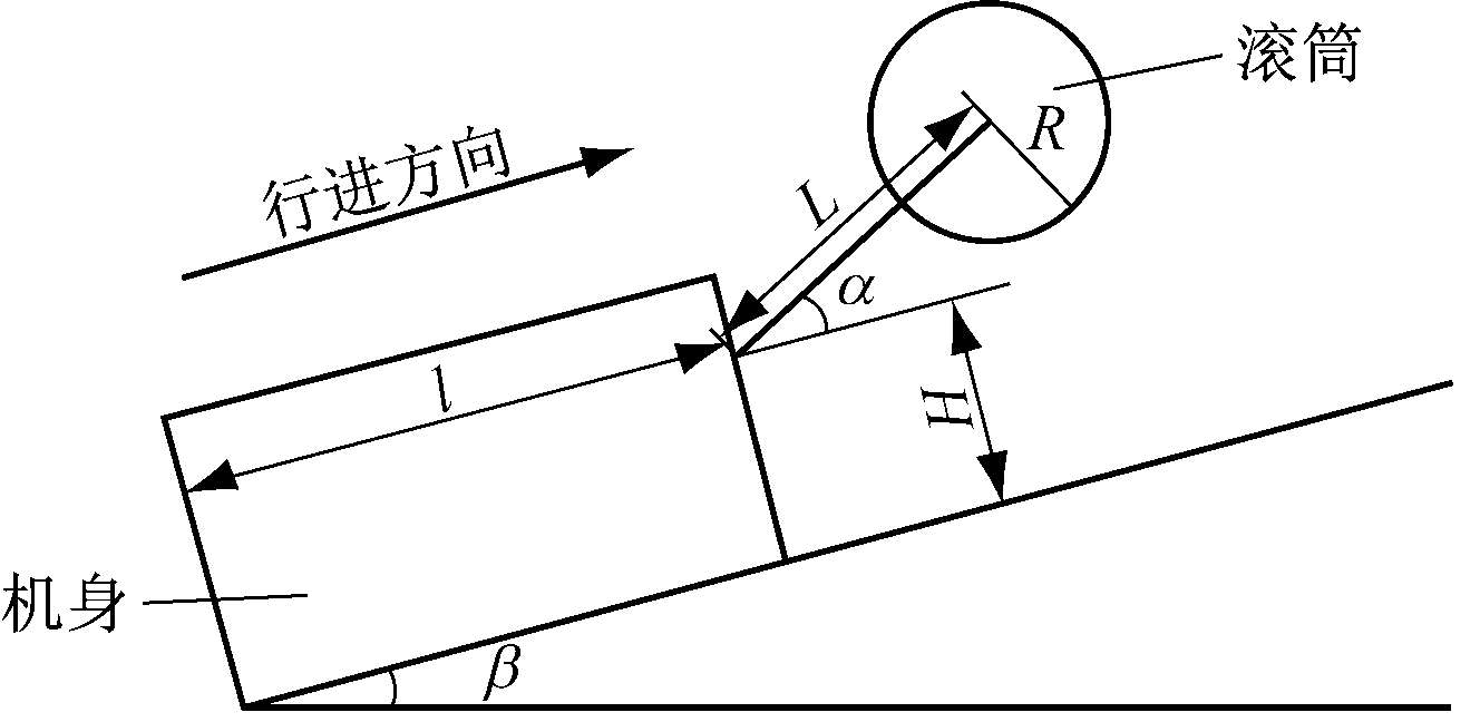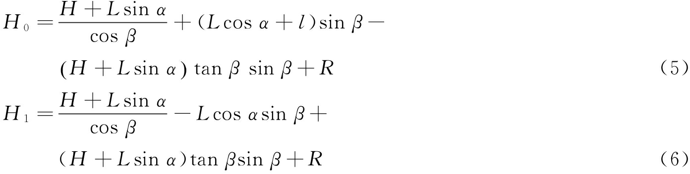 图2(a)、图2(b)为采煤机上下坡行进的情况。由于实际工作面坡度变化缓慢,所以位于采煤机机身平面中心点的传感器测得的倾角可作为整个采煤机机身倾角。H为摇臂与机身铰接处与地面的距离;L为摇臂长度;l为机身长度;R为滚筒半径;α为摇臂与机身平面的夹角;β为机身倾角。