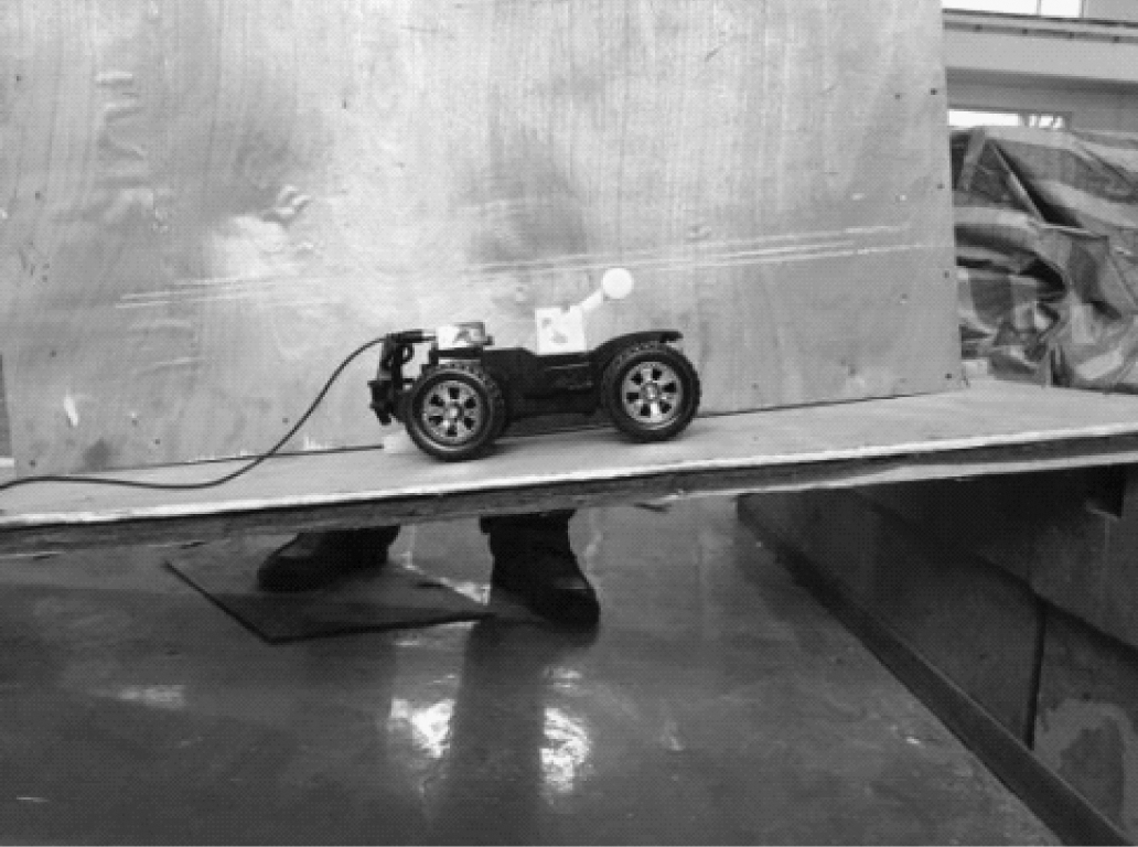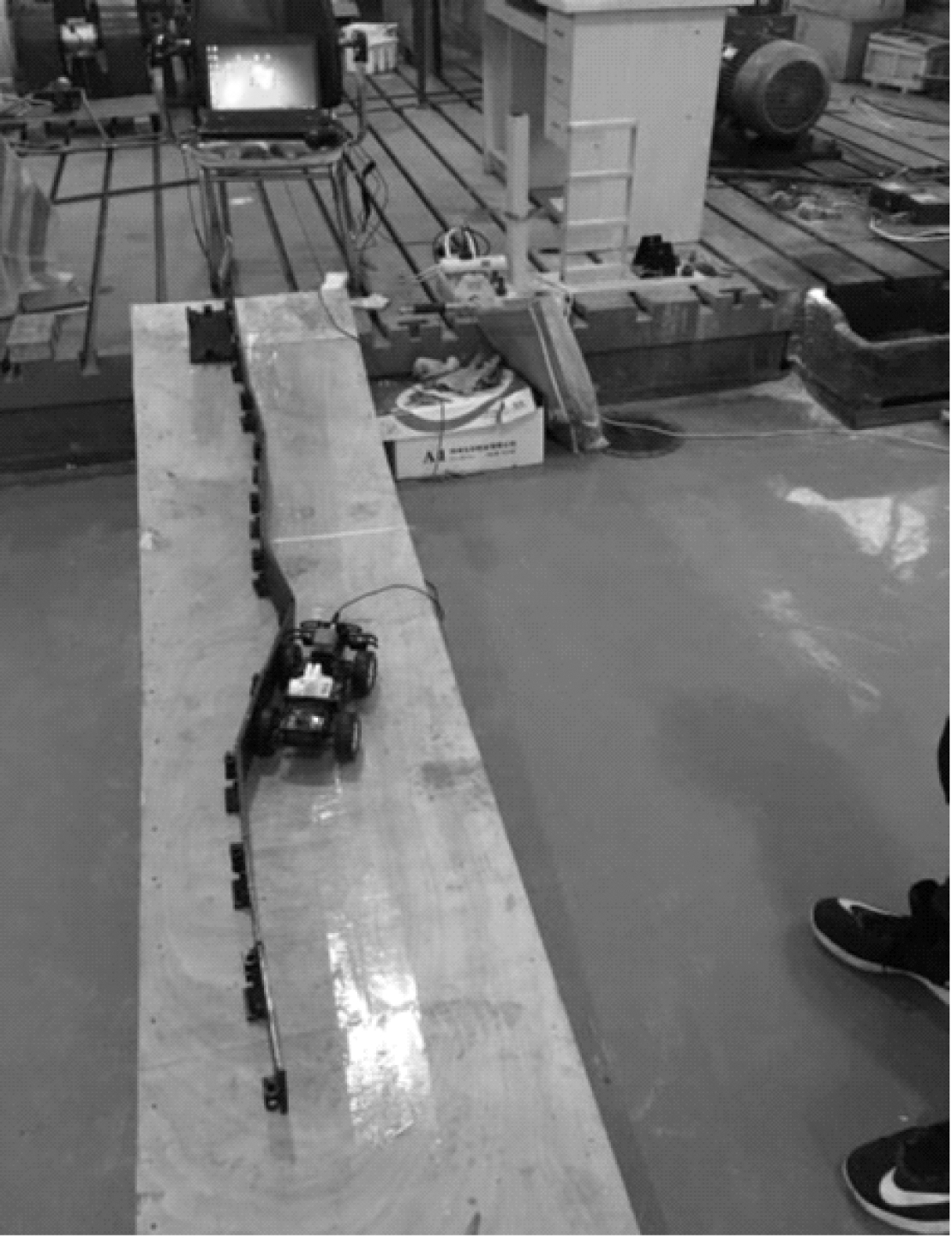 实验所用的小车尺寸为180 mm×100 mm×88.5 mm(长×宽×高)。在小车上搭载采煤机模型,摇臂旋转半径为60 mm,摇臂上滚筒宽度为19 mm。摇臂可以旋转至0~90°之间的任意角度,以满足实验需要。