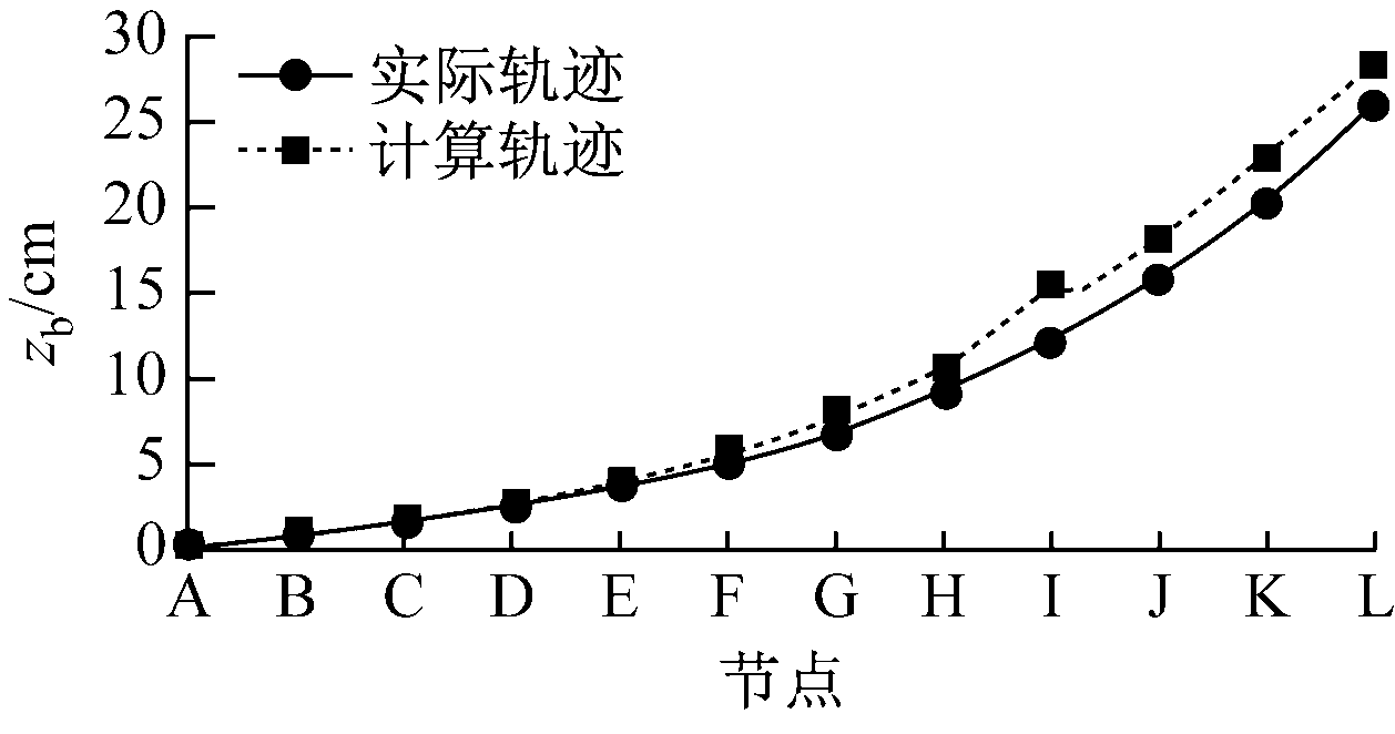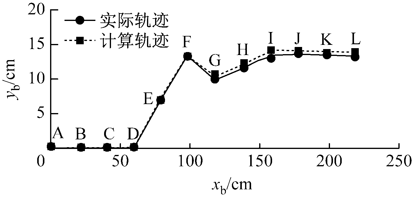 利用捷联惯导系统的位姿解算模块计算小车行驶至关键节点时的位置信息,并根据计算结果及表1绘制小车运动轨迹,如图4所示。可见计算轨迹与实际轨迹基本重合,I点的高度误差最大,经计算可知角度误差达1.9°。考虑到在实验过程中,斜面变形与小车自身减震器的影响会导致误差,且12个关键节点中只有1个节点的误差超过了1.5°,可认为计算轨迹与实际轨迹趋势基本一致。因此,捷联惯导系统可用于采煤机定位。