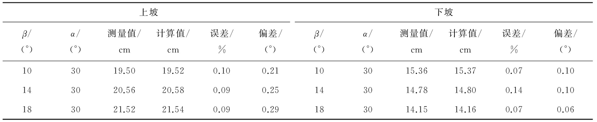 采用简易采煤机模型对截割高度与机身倾角的几何关系式进行验证,如图5所示。首先将摇臂与机身平面的夹角α设置为30°,之后将小车与摇臂模型放置在水平地面上,测量滚筒至地面高度。在NX8.0中建立与实物相同的模型来辅助测量。然后将小车分别放置在与水平地面呈10,14,18°(β=10,14,18°)的平面上,分成上下坡2种情况进行多次测量并取平均值,结果见表2。