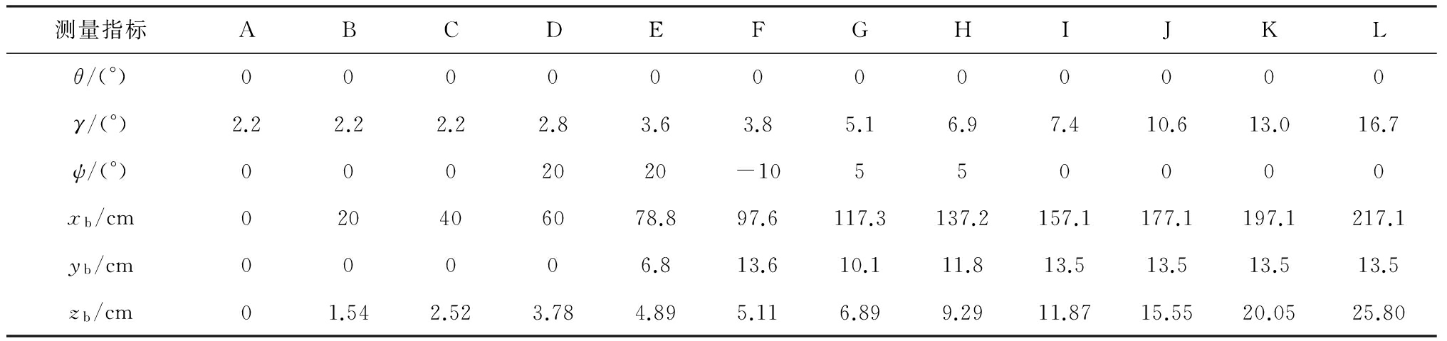 利用一些模块在斜面上构建一条轨道,如图3所示。令小车沿轨道行驶,通过捷联惯导系统采集三轴线加速度和三轴角速度并传输至计算机。选取12个关键节点A—L(12个轨道模块的中点),各关键节点的实际姿态和位置数据见表1。