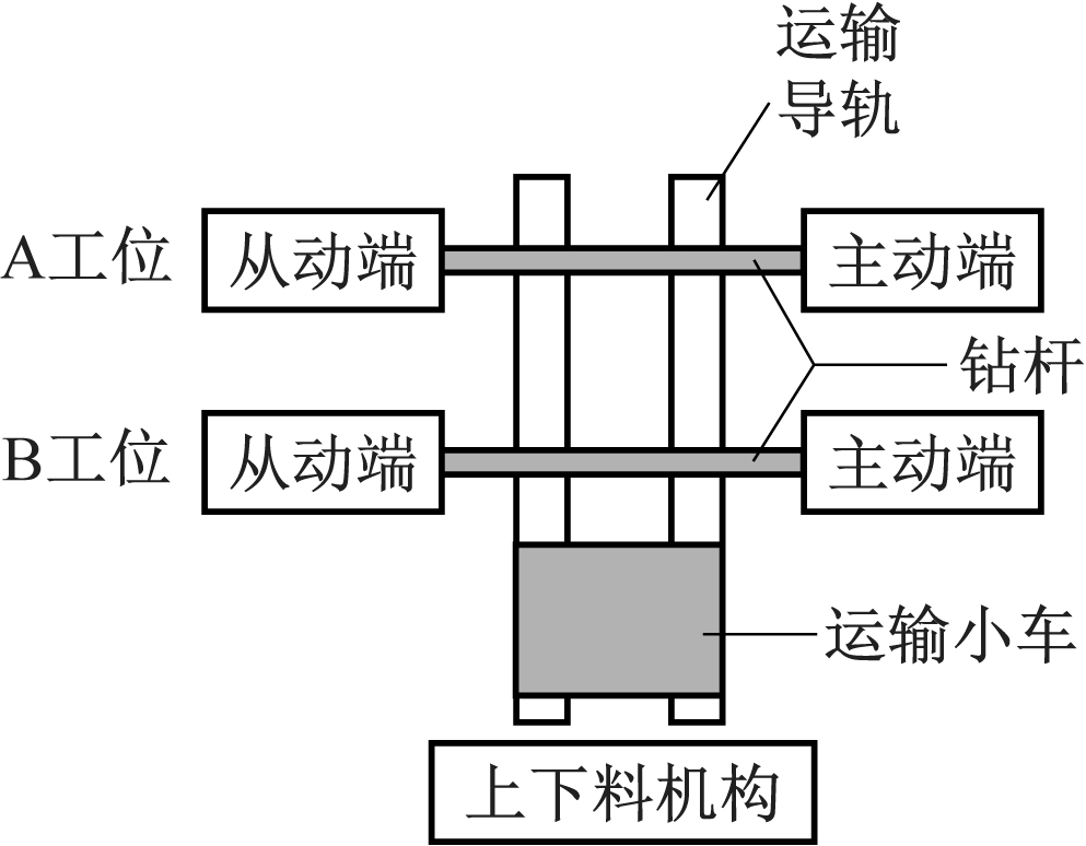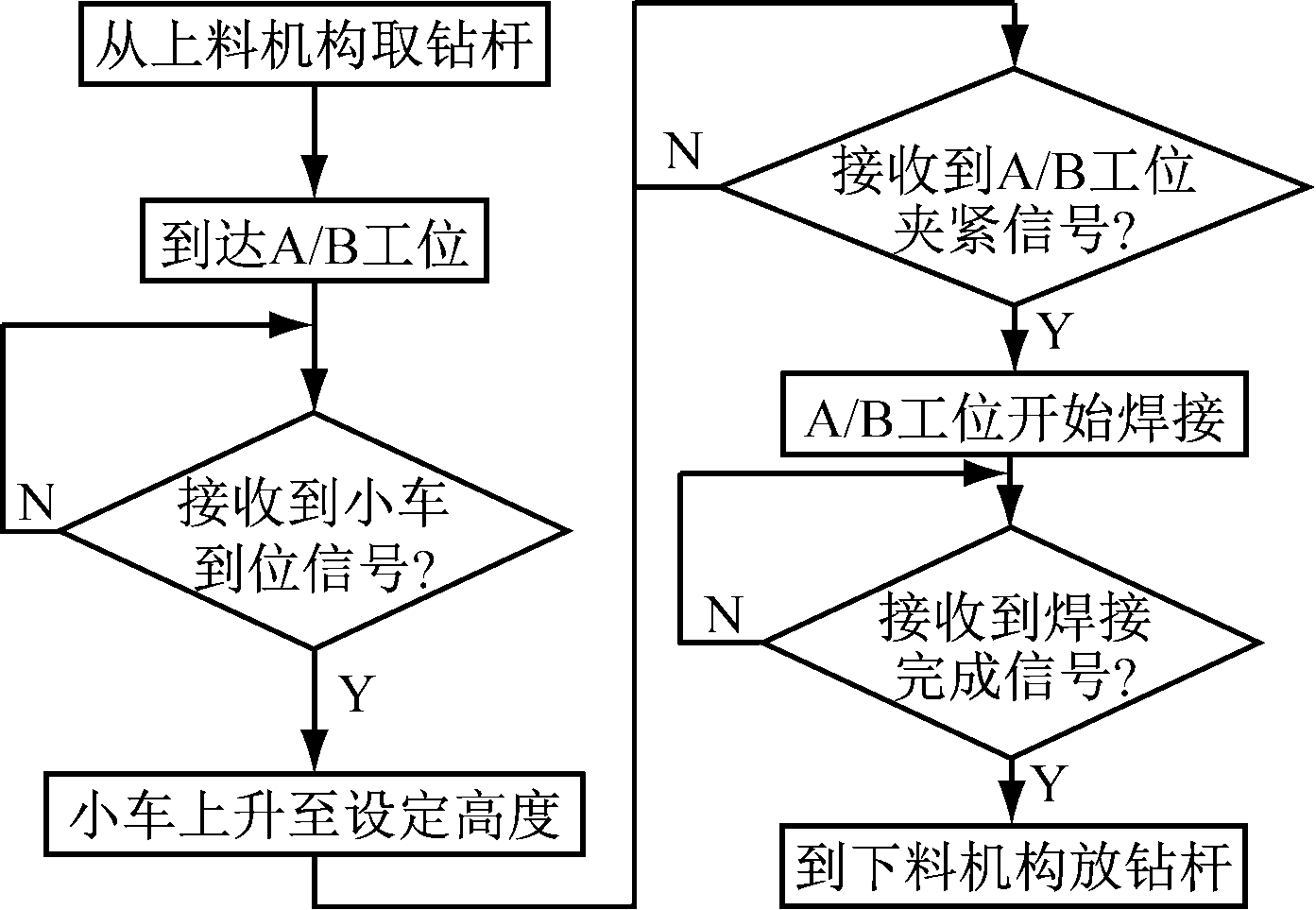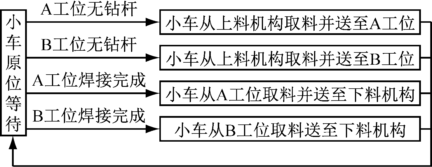 运输小车工作流程如图2所示。运输小车从上料机构接取需要焊接的钻杆并送至A工位,PLC系统接收到小车到位信号后,小车上升至程序设定的高度,否则将在A工位等待;上升到设定高度后,主动端和从动端会夹紧待焊接钻杆,并发出A工位夹紧信号;PLC系统接收到A工位夹紧信号后会对A工位钻杆进行翼片焊接;小车返回上料机构继续接取钻杆并送至B工位,流程与A工位相同。当检测到焊接完成信号后,小车到达相对应的工位,将焊接完成的钻杆送至下料机构,一个工作流程完成。