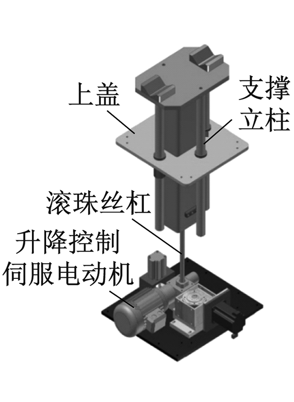 本体是运输小车的关键组成部分,主要包括滚珠丝杠、升降台、V型块、支撑立柱、升降控制伺服电动机、行走控制伺服电动机、外箱体、上盖、齿轮、定位销等,如图4所示。