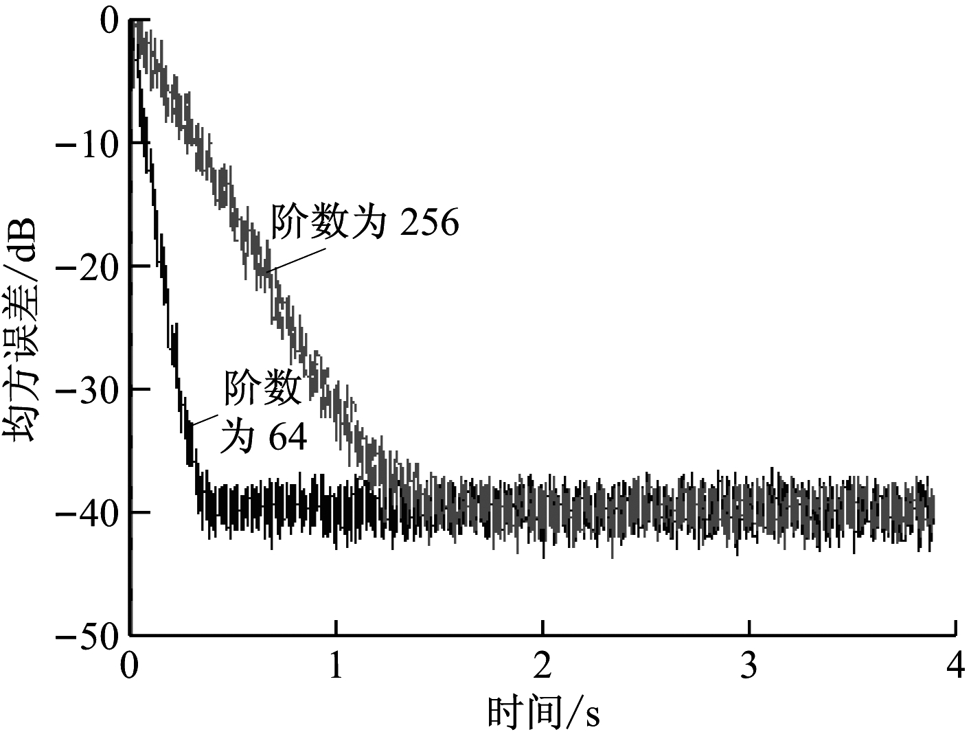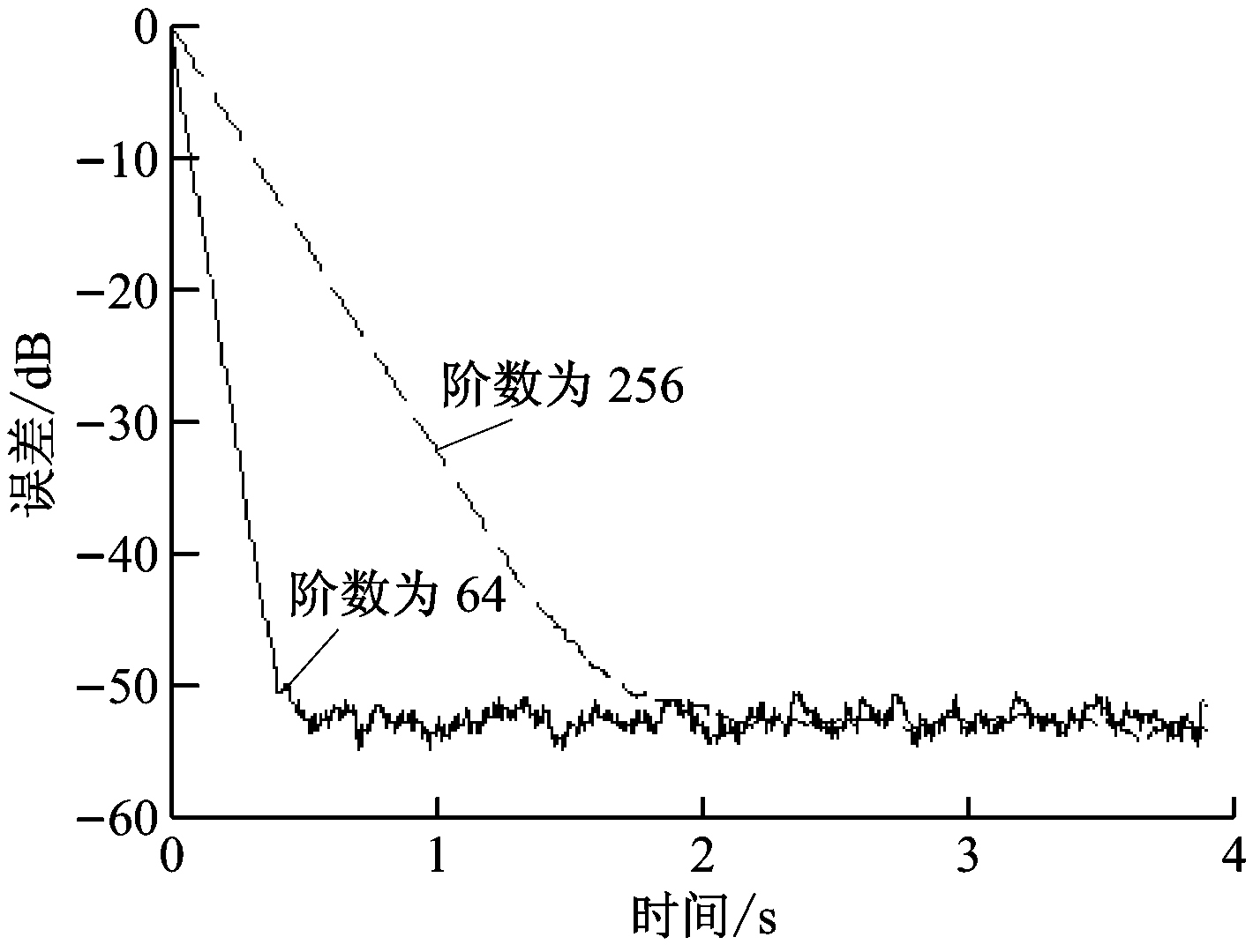 (1) 收敛速度。在静音语音模式下,随机提取一段背景噪声,FIR滤波器的阶数分别设置为64和256。经自适应回声消除器处理后,背景噪声误差、均方误差曲线分别如图3、图4所示。可看出滤波器阶数较大时,收敛速度较慢,但波动较小,稳态失调小,自适应回声消除器在纯回声情况下,在1 s内即可收敛到-30 dB以下。