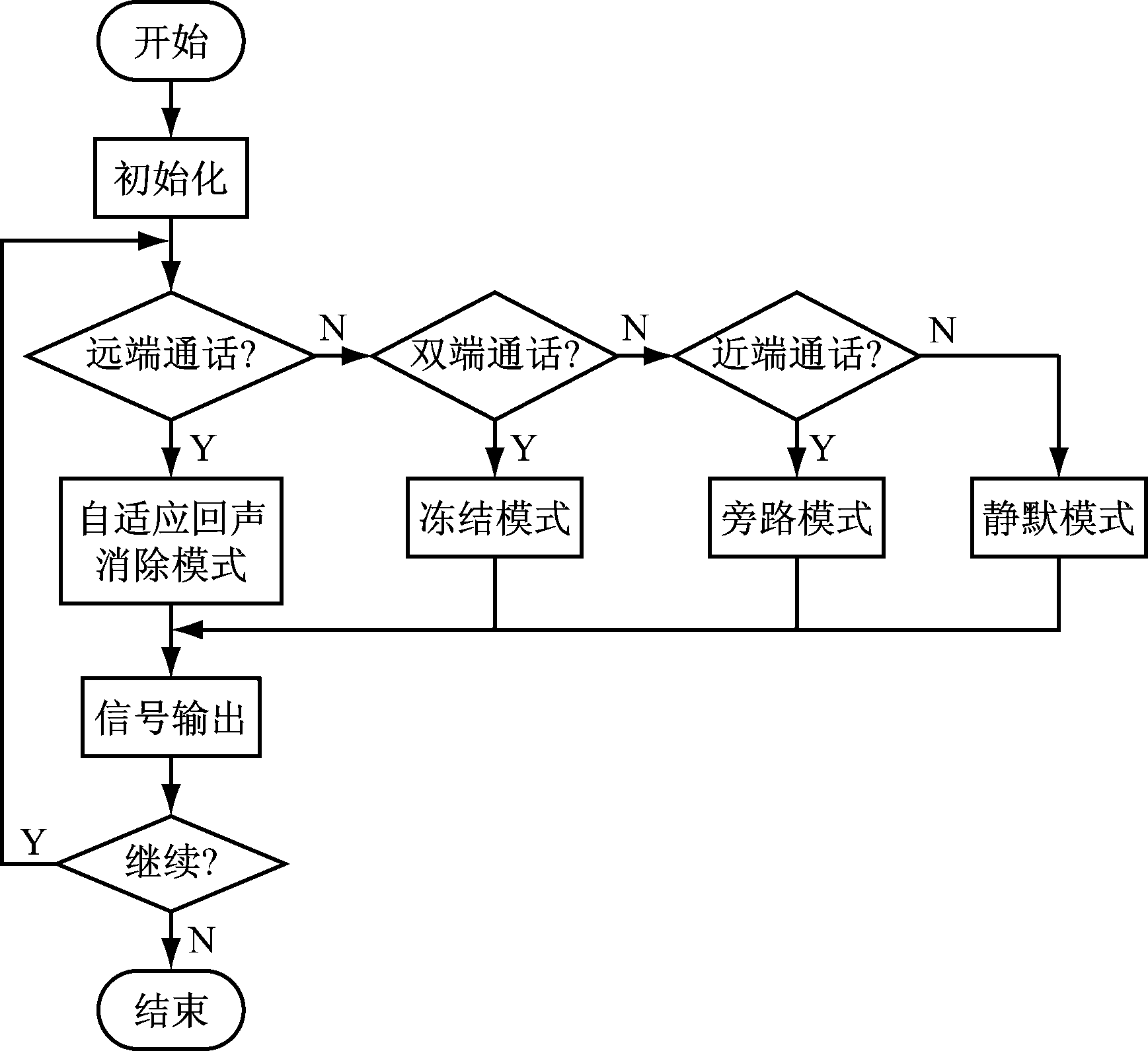 自适应回声消除器通过语音检测模块检测当前语音环境,根据远端通话、双端通话、近端通话和静音4种语音模式,分别选择对应的自适应回声消除、冻结、旁路和静默4种工作模式。