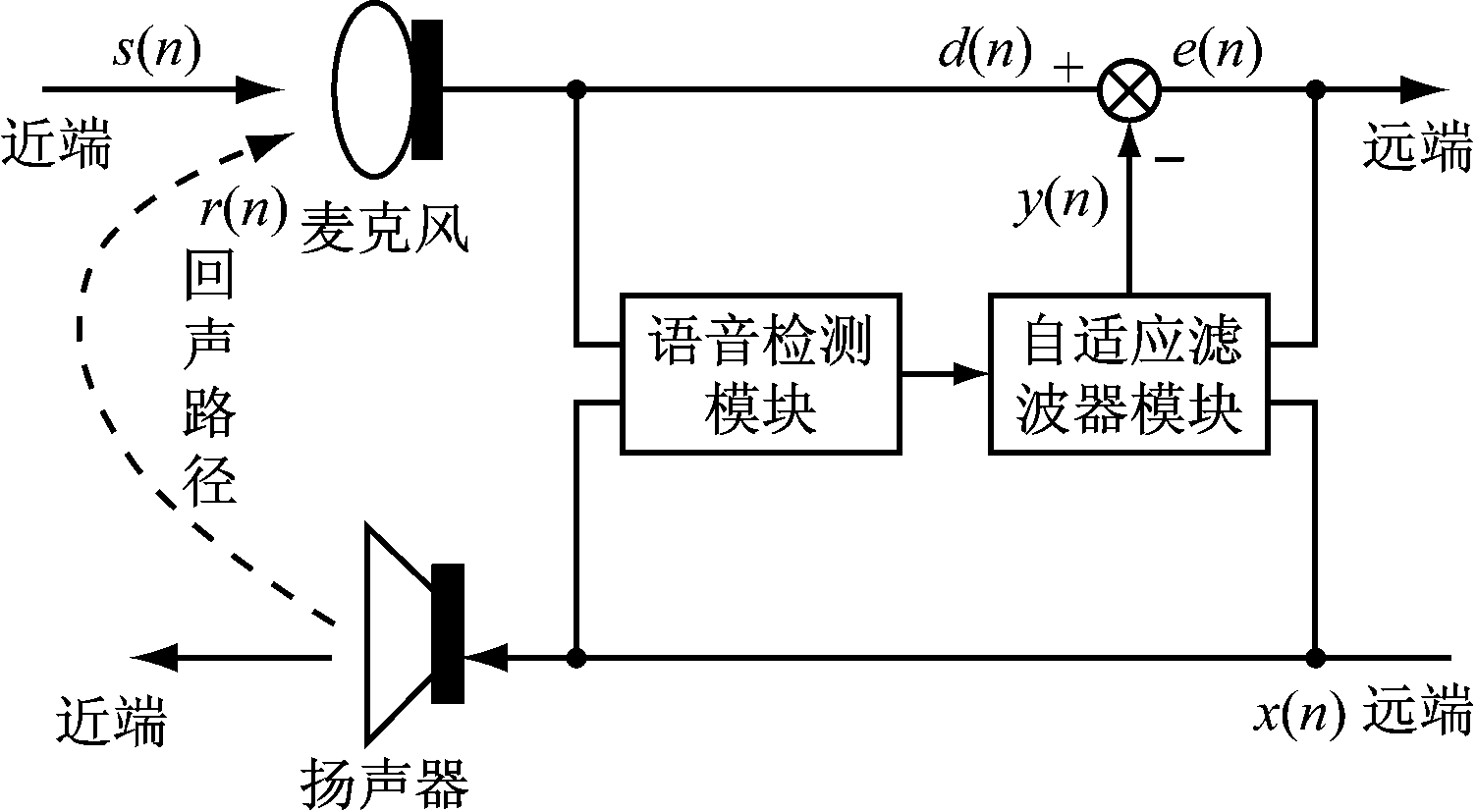 远端(扬声器端)输入信号x(n)经外界环境干扰形成回声信号r(n),原始语音信号s(n)和回声信号r(n)叠加形成近端(麦克风端)输入信号: