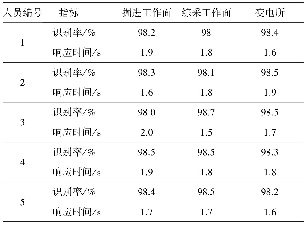 选取5名井下人员(编号为1—5),分别在掘进工作面、综采工作面、变电所进行系统识别率、响应时间试验。试验结果见表1。可看出系统对预警事件的识别率不低于98%,识别响应时间不大于2 s,满足煤矿井下预警需求。