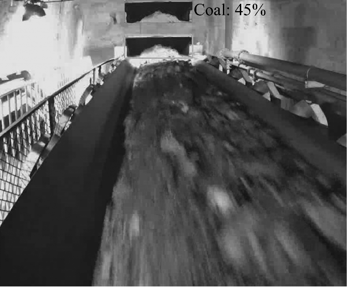 试验前划分电子围栏,设置胶带堆煤预警阈值为60%。当煤量占据电子围栏面积的60%且持续时间达到5 s时,系统认为达到预警条件并发出预警信息。随机选取视频图像,如图5所示,可看出当前堆煤监测数据为45%,没有达到预警阈值。