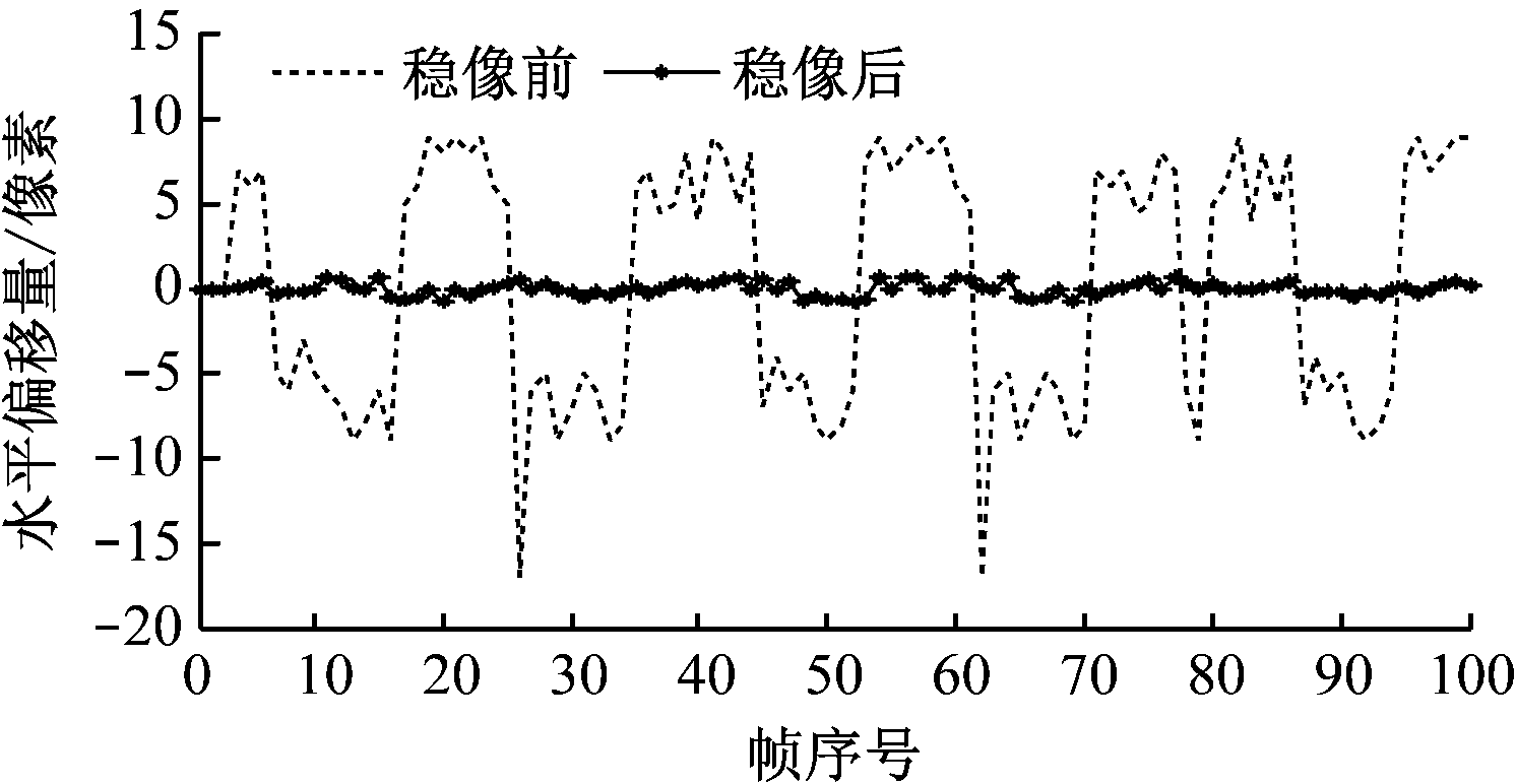 采用图像帧间的偏移量能够较好地反映视频稳像后的稳定情况,偏移量越小,说明稳像效果越好。采用连续100 帧视频序列,分析稳像前后水平方向偏移量(矿井车载摄像系统在水平方向抖动较明显)。图像稳像前后水平方向偏移量如图4所示,可看出本文算法对抖动视频具有较好的稳像效果。