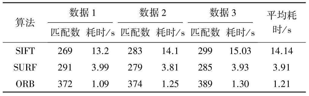 采用矿井视频图像中的3组数据测试SIFT,SURF及本文ORB算法的特征点匹配对数及实时性,结果见表1。可看出采用ORB算法得到的特征点匹配对最多,且耗时最少,平均耗时1.21 s。其算法处理速度约为SIFT算法的12倍、SURF算法的4倍,满足煤矿井下视频数据实时处理需求。