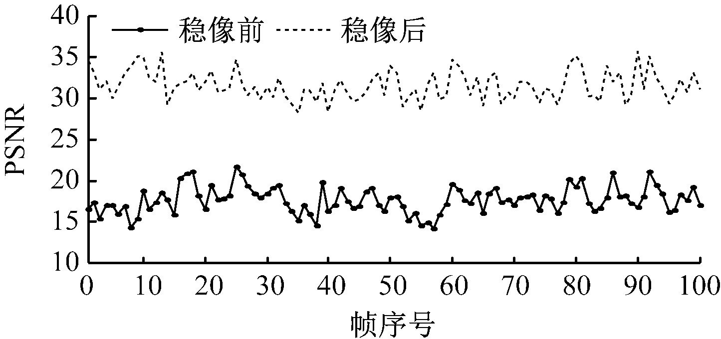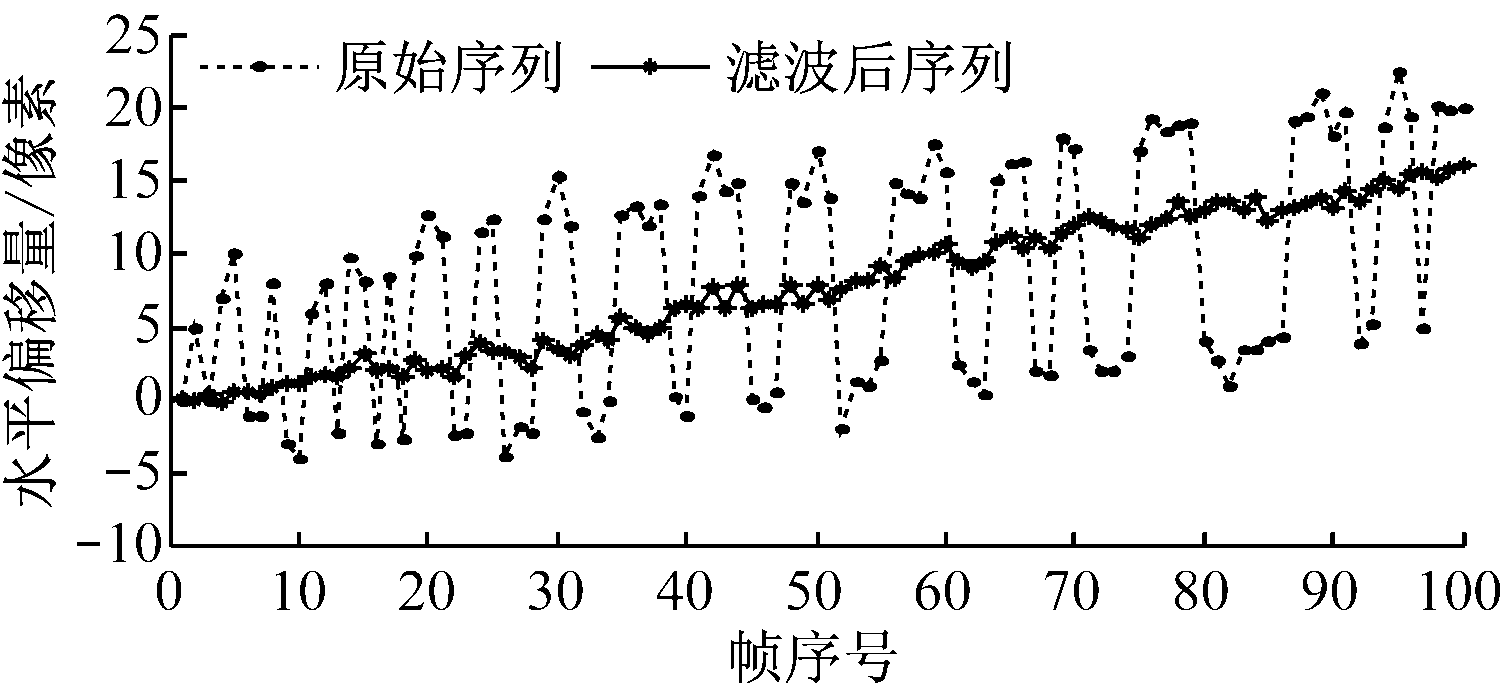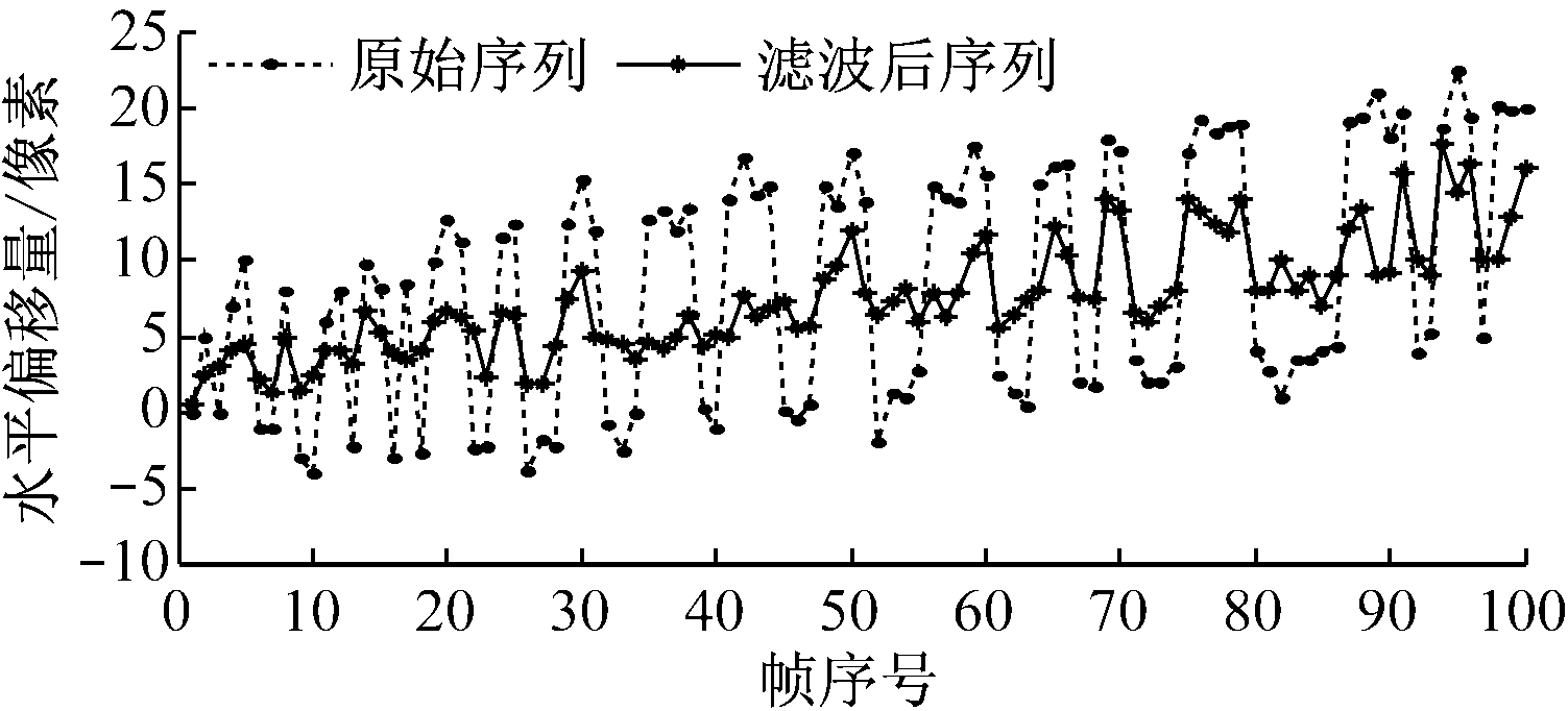 (2) 在运动滤波阶段,提出了基于估计窗的实时粒子滤波算法。通过该算法获取需要补偿的抖动分量,可有效解决滤波发散问题,且处理速度较传统粒子滤波算法提高约69%。