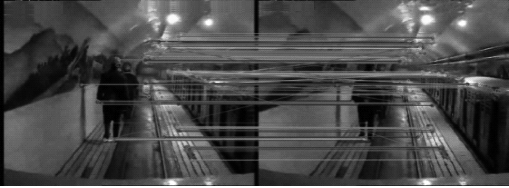 矿井车载摄像系统采集的视频序列存在较多的前景运动目标。原始ORB特征匹配效果如图2(a)所示,可看出特征点大部分分布在背景区域上,但是有一部分特征点在前景运动目标上。本文ORB特征匹配效果如图2(b)所示,可看出误匹配点得到有效消除。