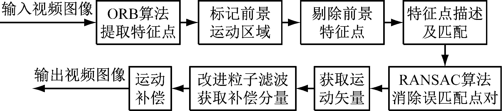 图1 基于ORB特征匹配与改进粒子滤波的矿井车载视频图像稳像算法流程