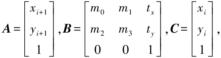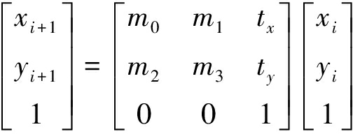 式中:(xi+1,yi+1),(xi,yi)分别为当前帧与参考帧的特征点坐标;m0,m1,m2,m3为图像的缩放与旋转分量;tx,ty分别为图像x,y方向的平移分量。