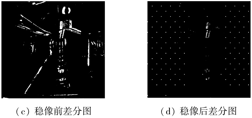 采用帧间峰值信噪比(PSNR)检验稳像前后相邻2帧图像的逼真度,PSNR越大,说明稳像效果越好。稳像前后图像PSNR如图5所示。可看出经本文算法处理后,图像PSNR明显高于原始图像。稳像前后的差分图如图6所示,其验证了本文算法具有一定的抗前景干扰能力。