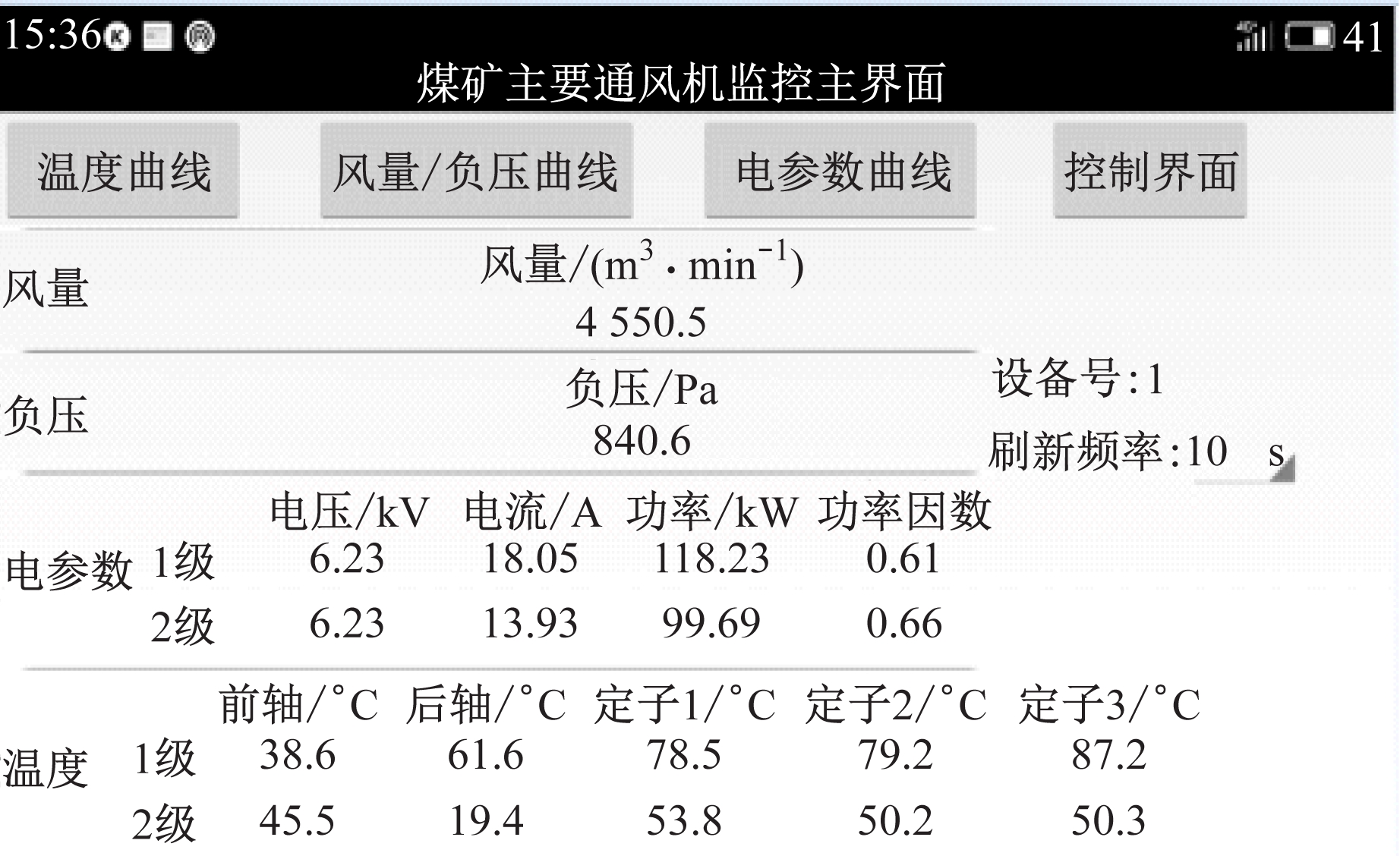 按要求完成系统配置后,对移动客户端的所有功能模块进行现场测试。首先在用户登录界面输入用户名和密码,验证成功后进入监控主界面。监控主界面自动显示主要通风机当前的风量、负压、电参数及各部分温度等信息。点击监控主界面上的“温度曲线”、“风量/负压曲线”、“电参数曲线”、“控制界面”按钮,自动弹出相应的参数显示界面或控制界面。在控制界面上,操作人员输入正确密码后,可对主要通风机电动机和风门进行控制。系统功能测试结果如图3所示。