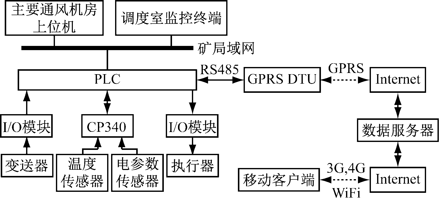 煤矿主要通风机的可靠运行对矿山生产安全具有重要意义。基于风量、负压、瓦斯浓度及通风机电动机的电参数、温度、振动等参数的主要通风机监控系统能够实时监测煤矿井下通风质量和通风机运行状态[1],有助于预防灾害发生,为通风机安全可靠运行提供保障。但煤矿主要通风机房地理位置较为偏僻,有线网络不易覆盖,因此主要通风机监控系统容易产生“信息孤岛”问题。随着3G,4G技术的不断发展,智能手机等移动设备已从简单的通信终端向移动互联网终端发展,可随时上网获取服务器上的信息。本文将移动设备应用于煤矿主要通风机监控领域,提出一种基于移动平台的煤矿主要通风机远程无线监控系统,以满足煤矿随时随地监控主要通风机运行状况的需求。