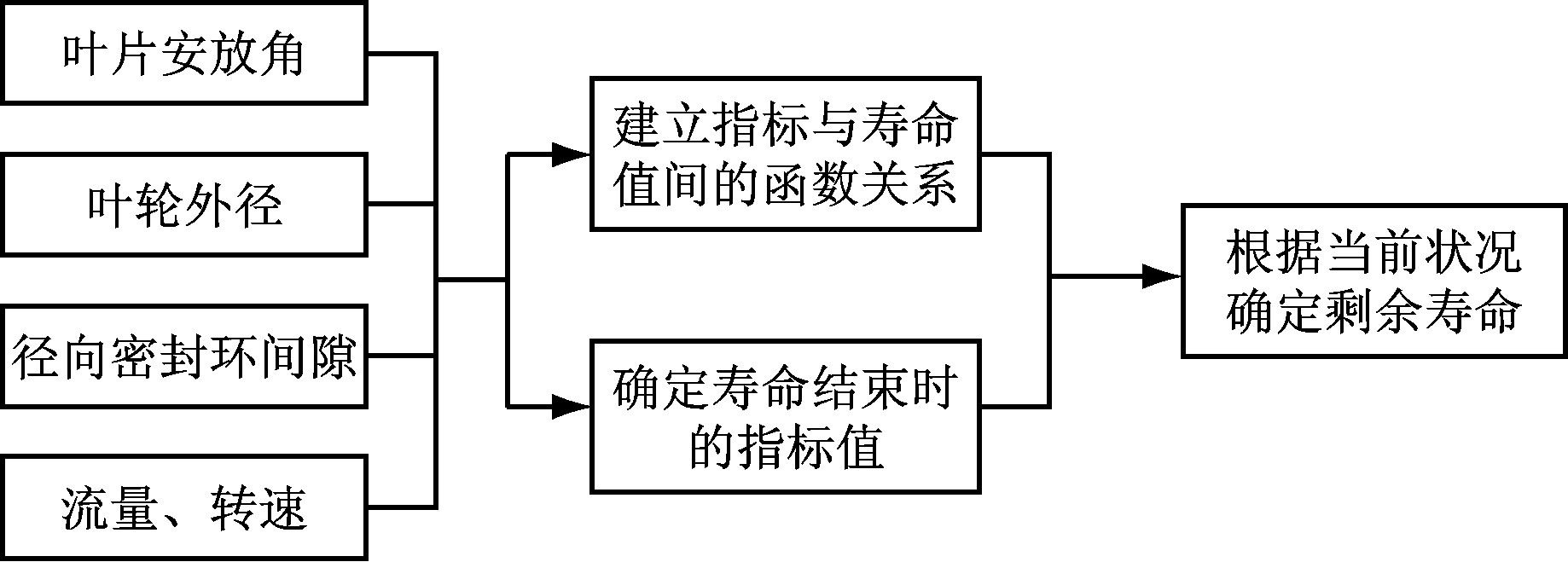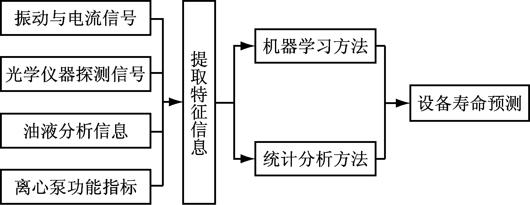 设备寿命预测可以分为两大类,一是通过分析、处理采集到的信号,得到相应特征量,在该特征量与寿命值之间建立相应映射关系,这种方法抓住了问题的本质;二是通过分析安放角、动态摩擦力矩、扬程等因素,建立它们与寿命值之间的映射关系,这种方法更直观,更具有说服力。二者各有优点,因此,综合考虑能更好地对设备寿命进行预测。以离心泵为例,可以采集离心泵的振动信号,得到信号特征值(均方根、标准差、峭度因子和裕度系数等),并通过传感器测量相对应时刻的扬程、效率,将二者相结合对离心泵的寿命进行预测,效果更好。