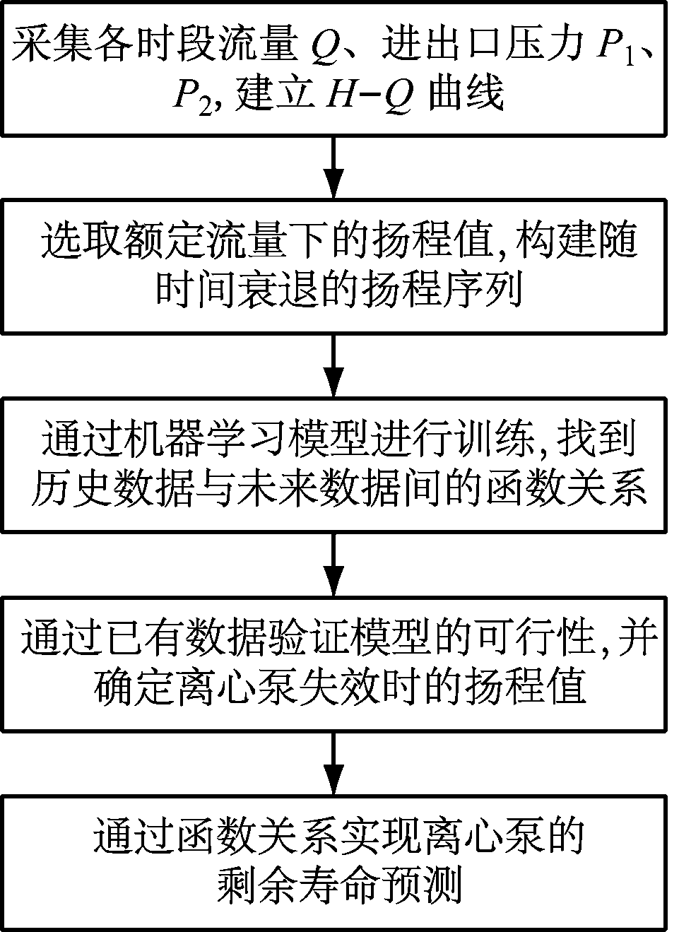 目前有关矿井排水设备寿命预测的研究甚少,姚宇等[10]基于机器学习方法给出了离心泵寿命预测的研究思路,如图1所示。在离心泵的运行过程中,等时间间隔地采集不同流量Q所对应的泵进口压力P1和出口压力P2,由式(1)可得所对应的扬程H,构建H-Q特性曲线[9]。