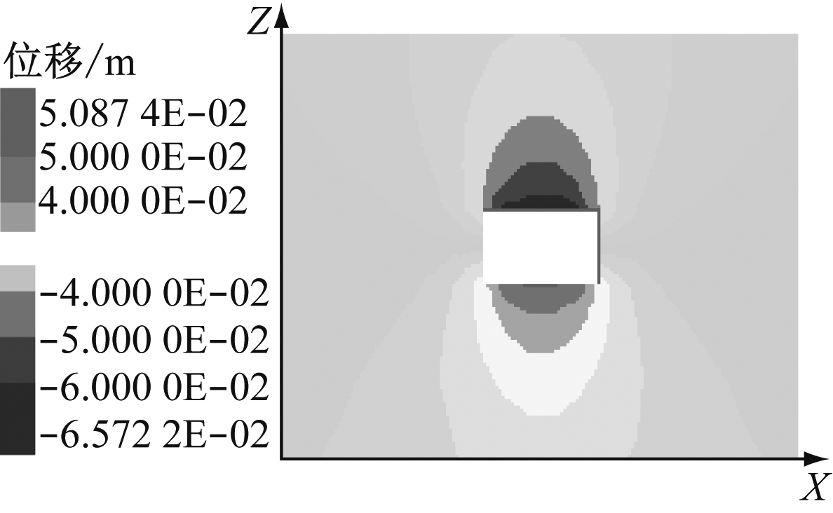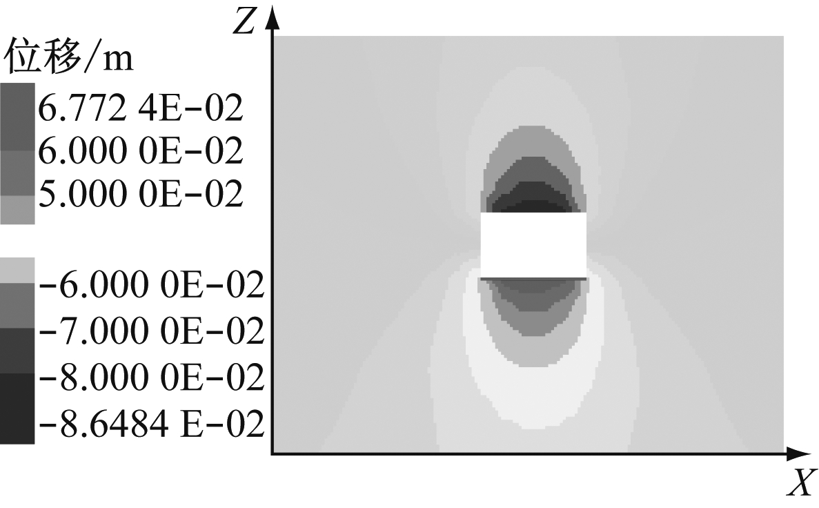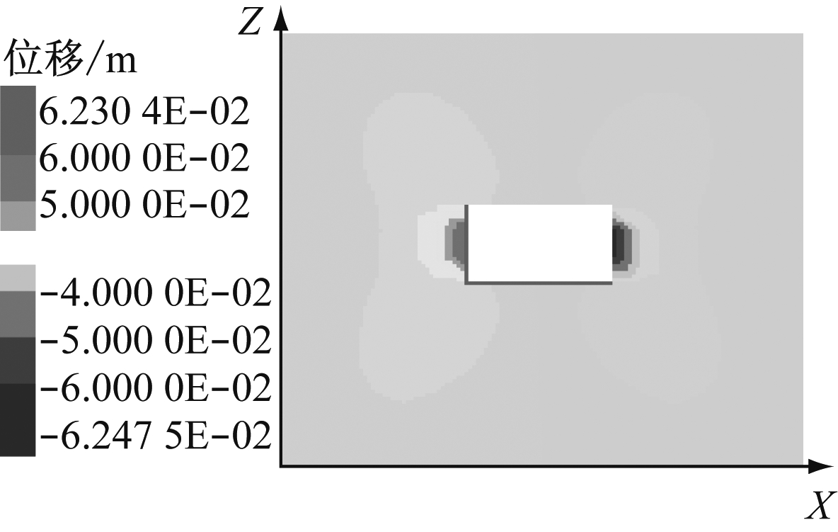 103回风巷塑性区分布云图、两帮位移分布云图、顶底板位移分布云图分别如图2—图4所示。由图2(图中每格代表1 m)可知,顶板浅部围岩受剪应力和拉应力作用发生塑性破坏,顶板深部围岩主要受剪应力作用发生剪切破坏,顶底板塑性破坏的最大深度为4 m,两帮塑性破坏的最大深度约为3 m,顶板塑性区向巷道两角斜上方发展,出现类似方形的塑性区。由图3和图4可知:左帮移近量为62.3 mm,右帮移近量为62.4 mm,两帮相对收敛值为124.7 mm;顶板向下位移67.2 mm,底板向上位移86.5 mm,顶底板相对收敛值为153.7 mm。