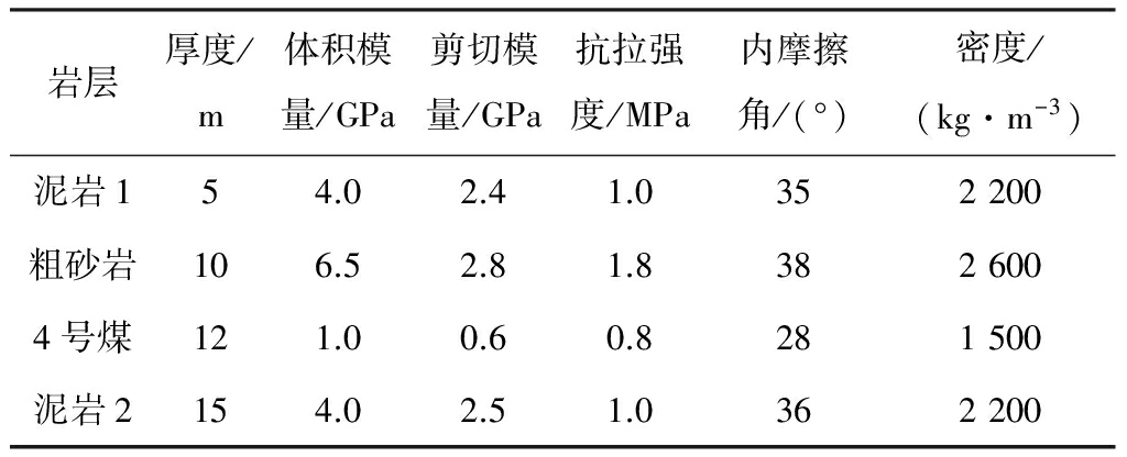 采用FLAC3D 5.0数值模拟软件建立巷道开挖模型,分析103回风巷和202回风巷开挖后围岩应力状态和位移变化。模型长×宽×高为100 m×60 m×42 m,模型的宽度、长度、高度方向分别为X,Y,Z轴。矩形巷道位于模型中部,巷道长×宽×高为80 m×6 m×4 m。模型采用摩尔-库仑破坏准则,各岩层物理力学参数见表2。