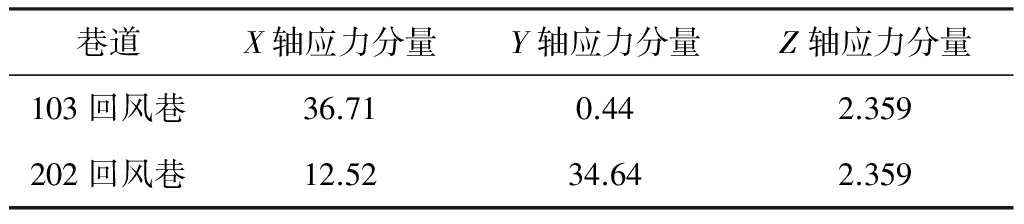 根据地应力测量结果,最大水平主应力为38.67 MPa,垂直主应力为23.89 MPa,最小水平主应力为8.5 MPa。103回风巷轴向与最大水平主应力方向夹角为78°,202回风巷轴向与最大水平主应力方向夹角为12°。模型上表面施加均匀的垂直应力,模型X轴与Y轴方向两侧面施加分解后的水平应力,模型下表面固定,没有位移,考虑实际情况,同时计入重力影响,应力分量见表3。