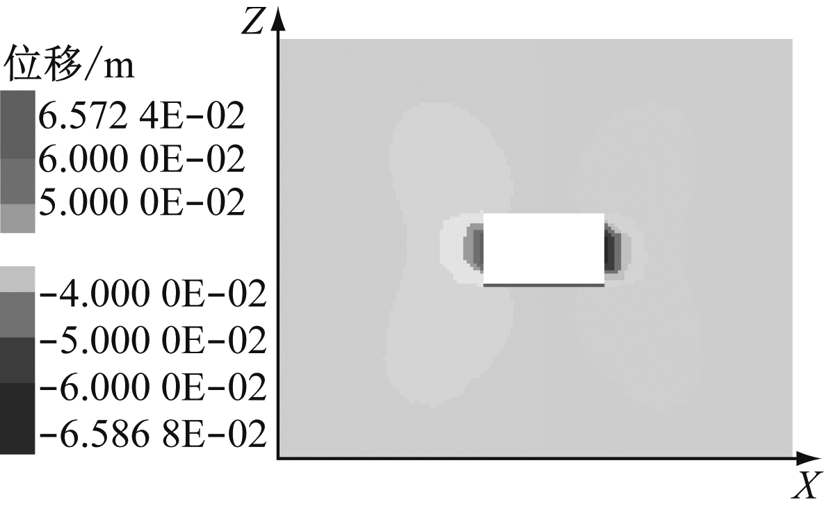202回风巷塑性区分布云图、两帮位移分布云图、顶底板位移分布云图分别如图5—图7所示。由图5(图中每格代表1 m)可知,巷道开挖后,原有应力被扰动,顶底板受剪应力和压应力作用发生塑性破坏,破坏区域深度约为3 m,巷道两帮主要受剪应力作用发生剪切破坏,破坏区域深度约为2 m,巷道围岩破坏区域呈椭圆状。由图6和图7可知:左帮移近量为65.7 mm,右帮移近量为65.8 mm,两帮相对收敛值为131.5 mm;顶板向下位移58.9 mm,底板向上位移65.7 mm,顶底板相对收敛值为124.6 mm。