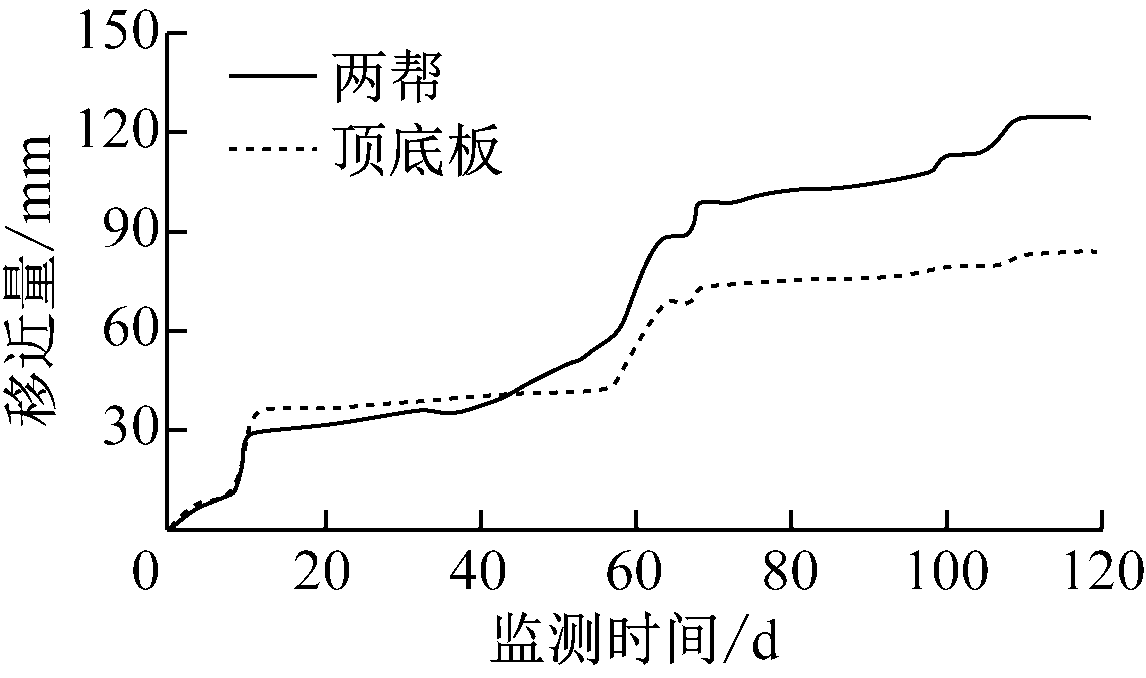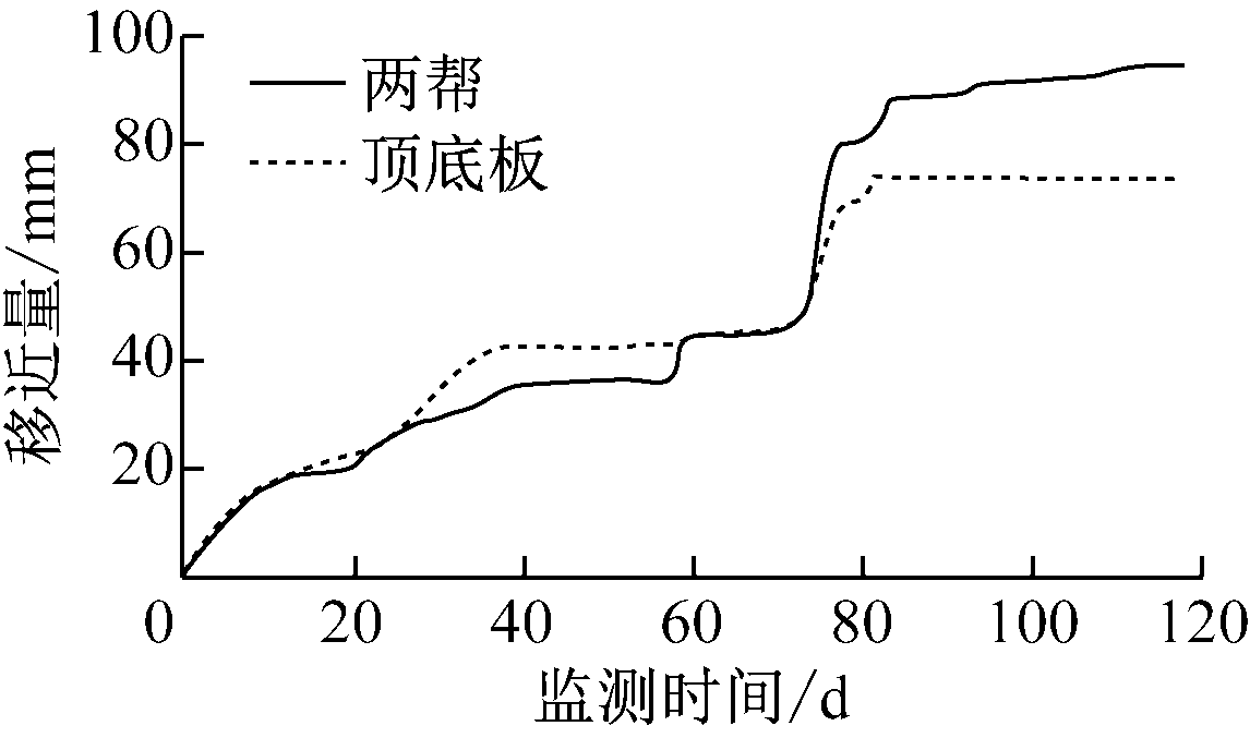 对103回风巷和202回风巷从开始掘进到围岩变形稳定进行监测,结果如图8、图9所示。从图8、图9可看出:103回风巷两帮最大移近量为124 mm,顶底板最大移近量为83 mm,两帮最大收敛速率为7 mm/d,顶底板最大收敛速率为10 mm/d;202回风巷两帮最大移近量为94 mm,顶底板最大移近量为73 mm,两帮最大收敛速率为6 mm/d,顶底板最大收敛速率为5 mm/d。现场观测时,103回风巷处经常听到煤炮声,出现多根锚杆、锚索破断,202回风巷处锚杆、锚索没有出现任何破坏现象。103回风巷围岩变形程度大于202回风巷,验证了数值模拟的可靠性。