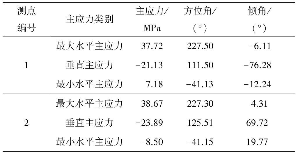 从表1可看出:高家堡煤矿地应力场以水平应力为主,属于水平应力场类型,该类型地应力场对巷道顶底板的稳定较为不利;高家堡煤矿最大水平主应力为38.67 MPa,大于30 MPa,属于超高地应力区[10-11];高家堡煤矿最大水平主应力方位角为227.30°。