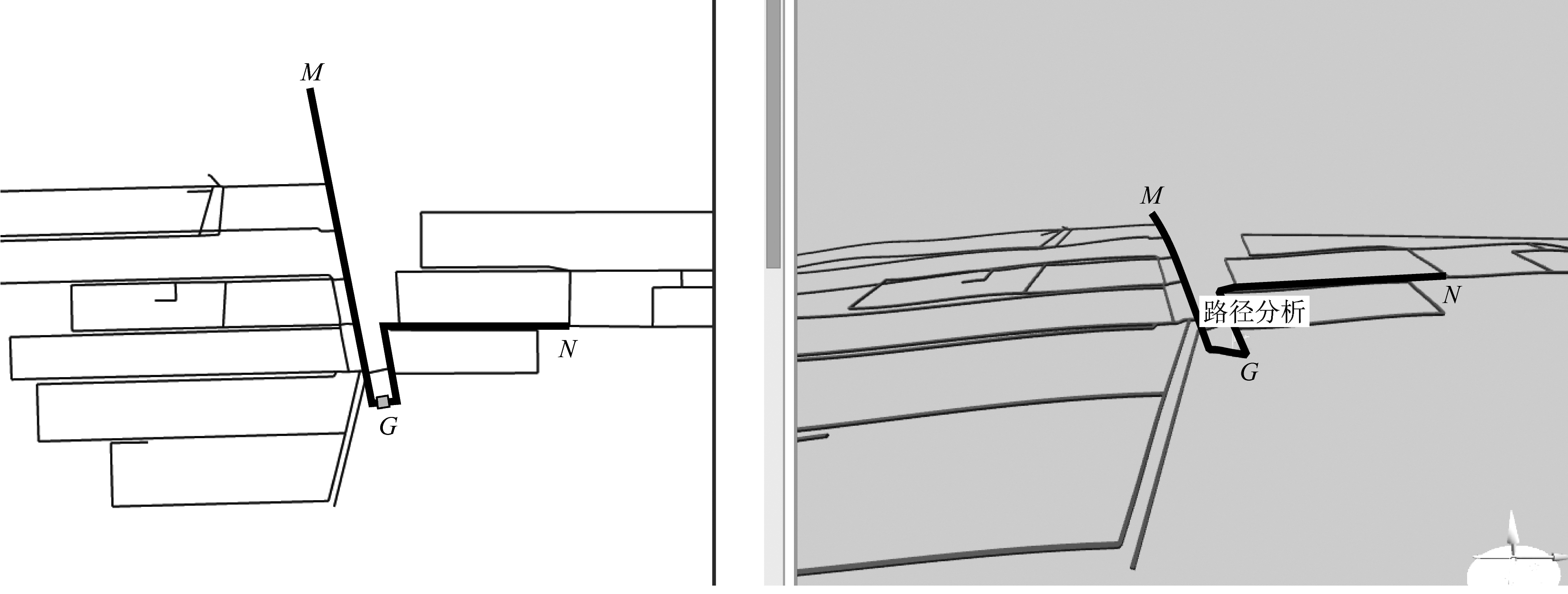 视图对应关系如图5所示。三维窗口的相机在Z轴方向倾斜面向视图中心点,二维窗口中心点显示正确,可以证明二维、三维视图一致。图5中线段MN是分析出的一条路径,点G沿路径方向移动,可以证明三维巷道也具备拓扑关系。