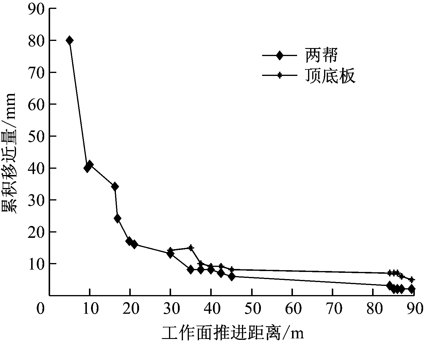 在榆林矿区某矿大采高综采工作面回风巷对大采高垛式液压支架进行了现场测试。支架在综采工作面采用两排对称方式布置,为实现支架自移,前后相邻支架间距不得大于推移千斤顶行程,同时为实现对巷道的有效支护,并列两排支架顶梁间距不得大于900 mm。在回风巷顶底板和两帮处各设1个观测点,测量得到累积移近量和工作面推进距离关系曲线,如图5所示。可看出巷道累积移近量随着工作面的推移逐渐缩小,表明采用大采高垛式液压支架进行巷道超前支护后,工作面巷道围岩变形量小,巷道处于稳定状态,验证了大采高垛式液压支架设计的合理性。