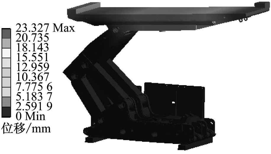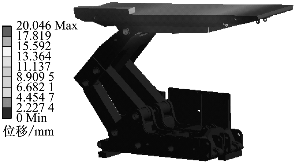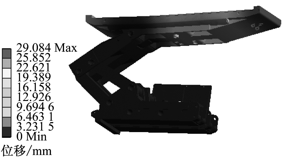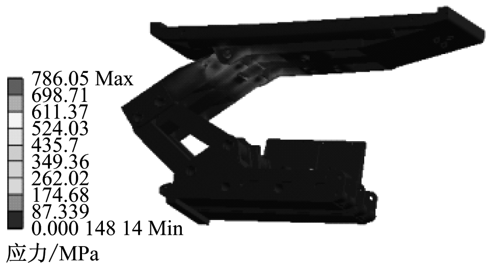 从图2—图4可看出:液压支架最大应力均出现在前连杆与掩护梁铰接的销轴孔处,在顶梁集中载荷与底座偏载工况下应力最大,达786.05 MPa,顶梁偏载与底座扭转工况下应力最小,液压支架其余部位受力均匀,均未出现应力集中现象;液压支架最大变形均出现在顶梁前端,在顶梁集中载荷与底座偏载工况下变形量最大,达29.084 mm,顶梁偏载与底座扭转工况下变形量最小,顶梁前端至顶梁后部变形量逐渐减小,液压支架其余部位变形偏小,均未出现较大变形。